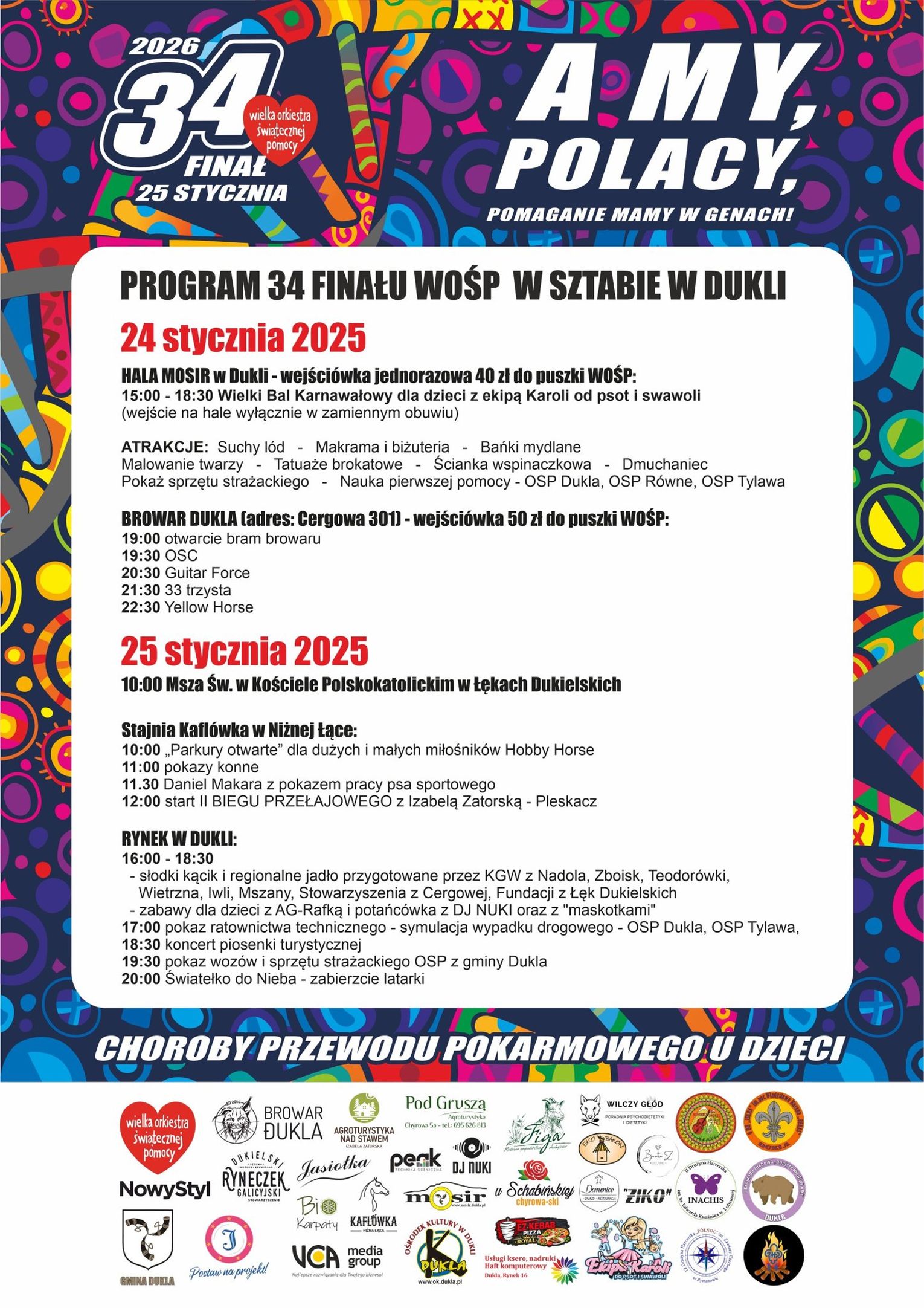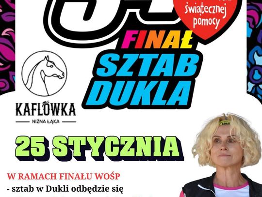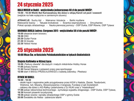 Finałowy weekend rozpocznie się w sobotę (24 stycznia) o godz. 15:00 w Miejskim Ośrodku Sportu i Rekreacji w Dukli, gdzie odbędzie się bal karnawałowy dla dzieci. W programie zaplanowano cztery godziny zabawy oraz warsztaty animacyjne prowadzone przez ekipę „Karoli do psot i swawoli”. Wejściówka – 40 zł do puszki WOŚP.