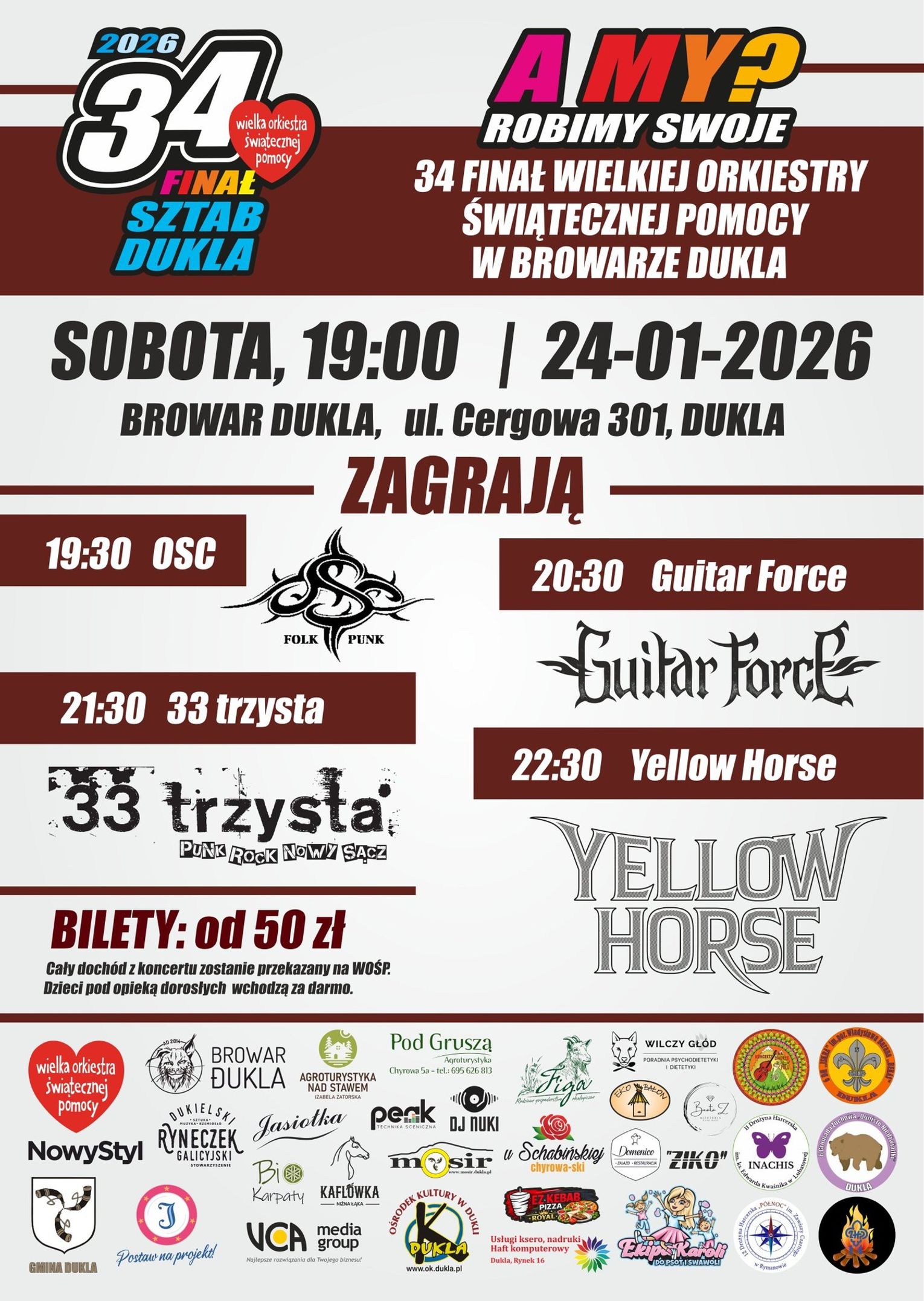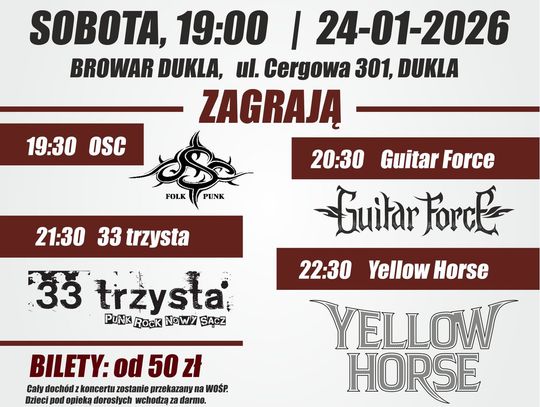 Wieczorem (od godz. 19:00) koncert i licytacje w Browarze Dukla. Wystąpią: OSC, Guitar Force, 33 trzysta i Yellow Horse.