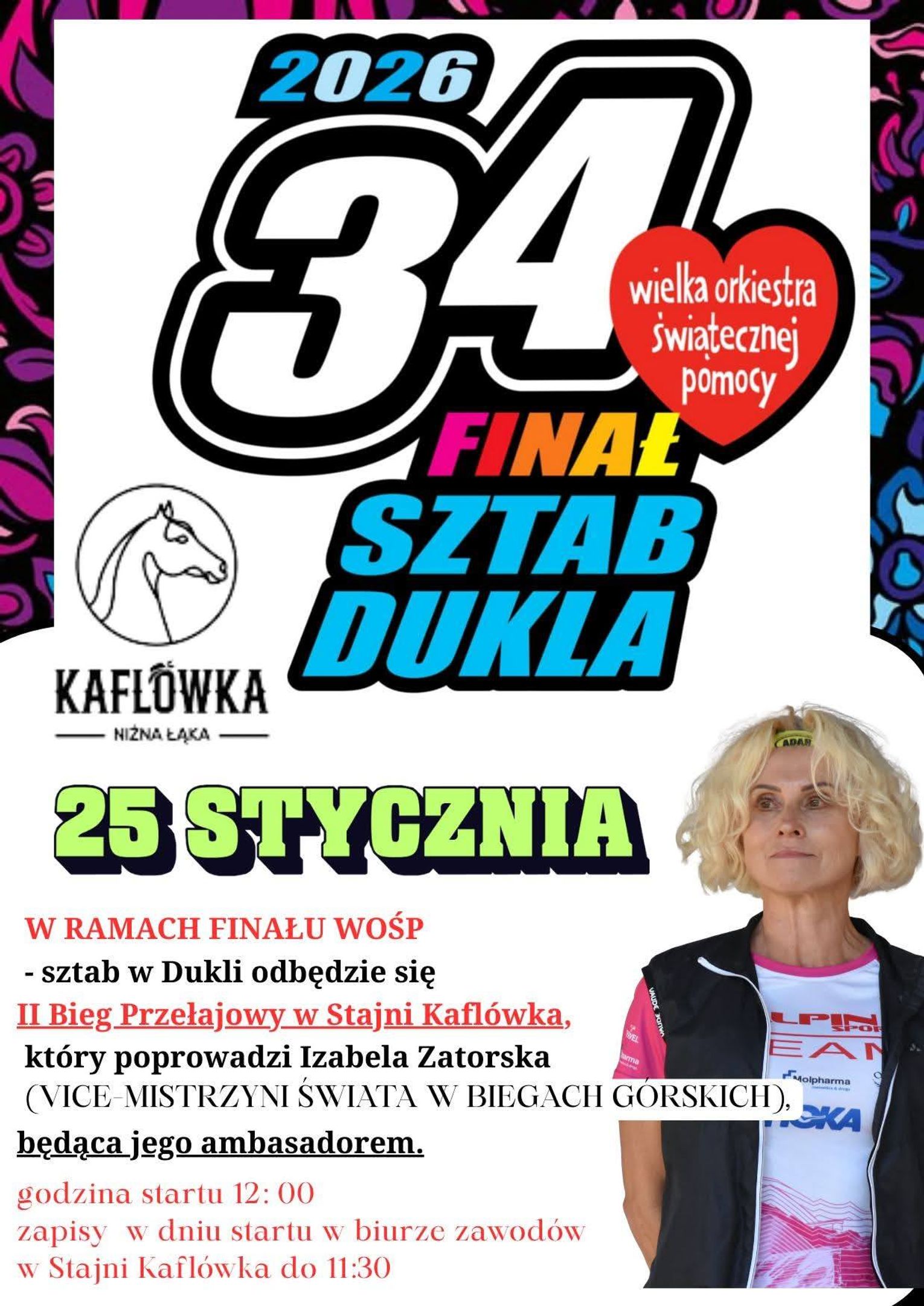 Tego dnia odbędzie się również II Przełajowy Bieg WOŚP w Stajni Kaflówka. Bieg poprowadzi Izabela Zatorska-Pleskacz, wielokrotna mistrzyni Polski w biegach górskich. Szczegóły TUTAJ.