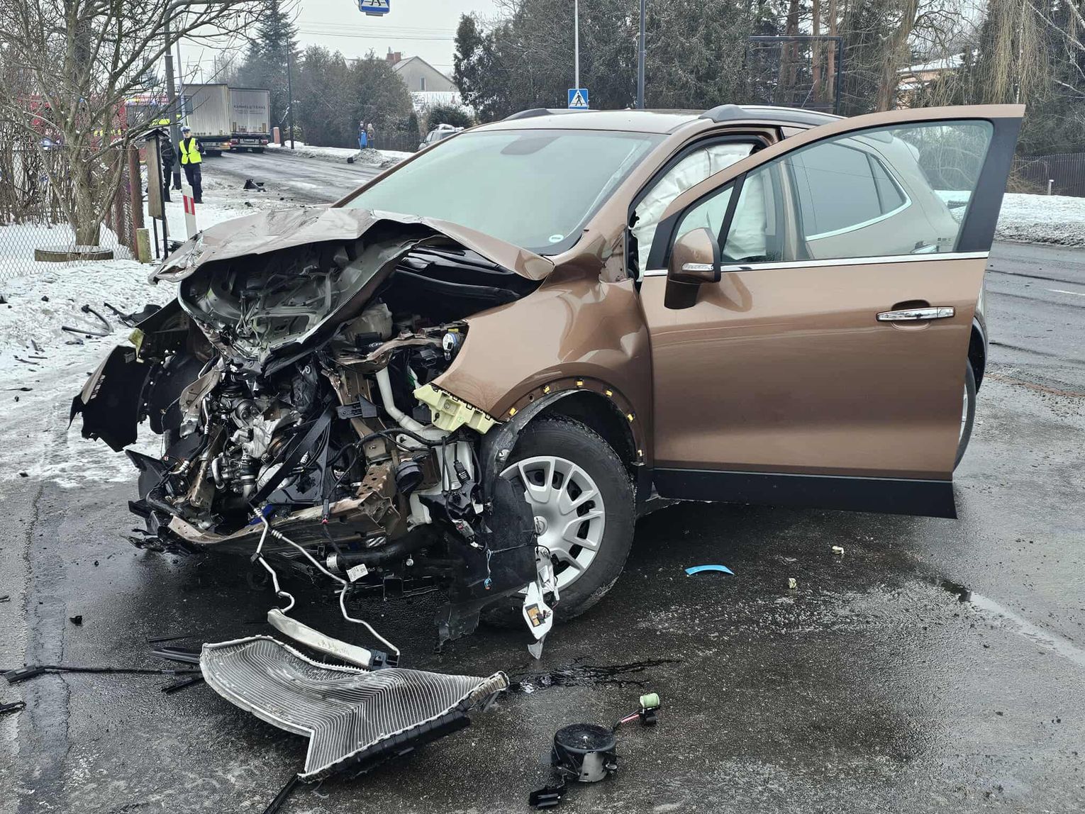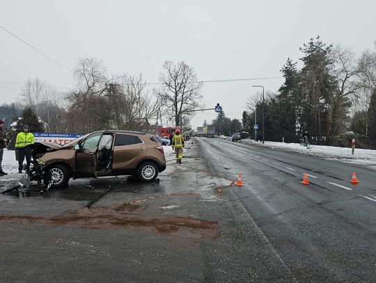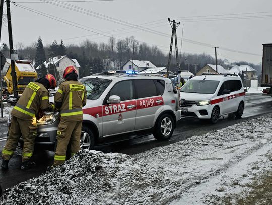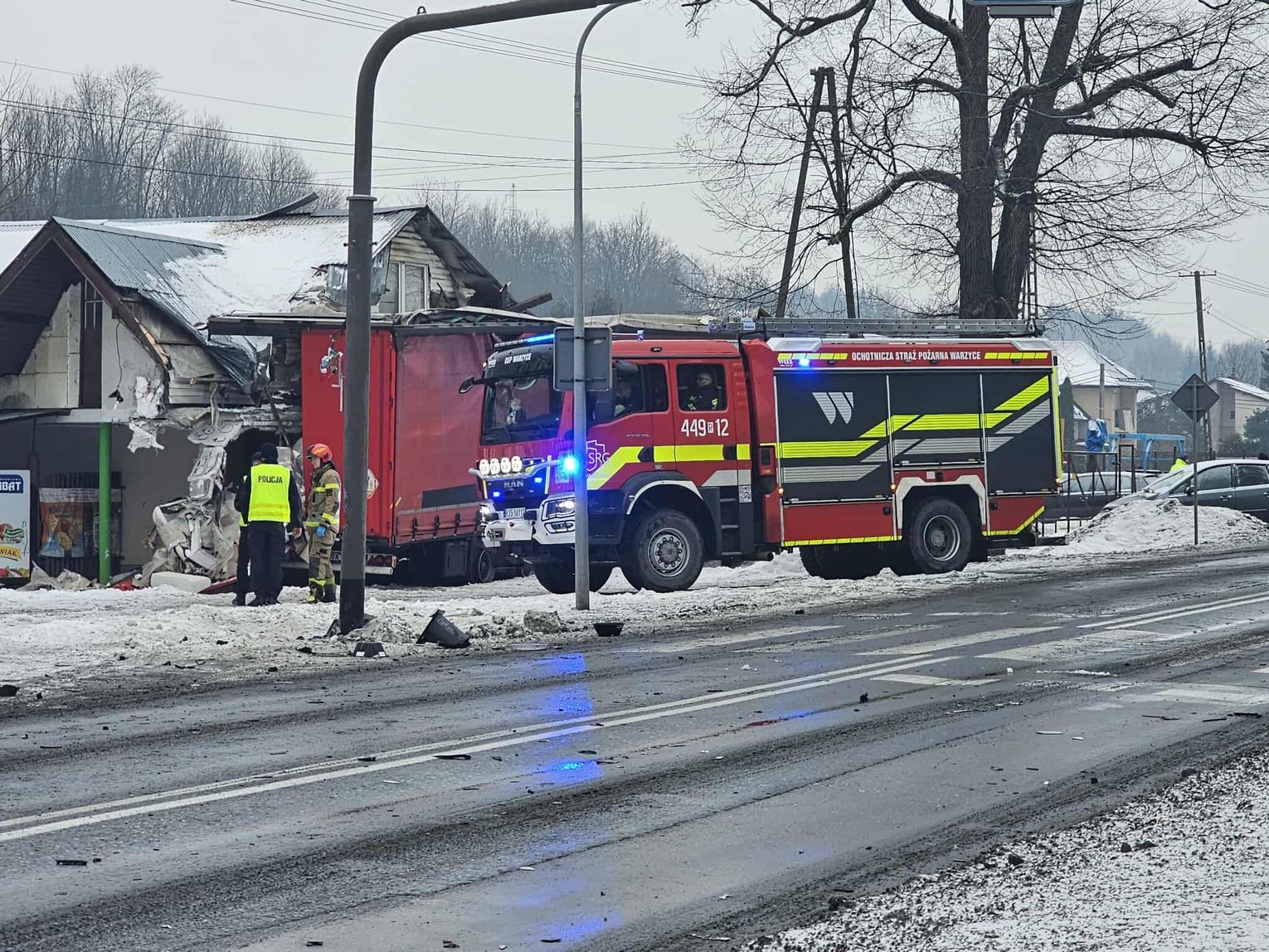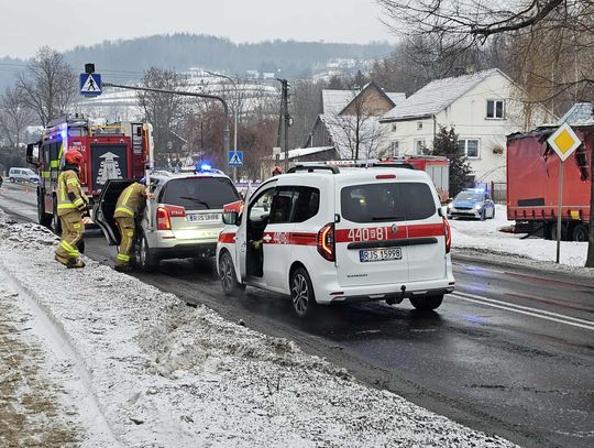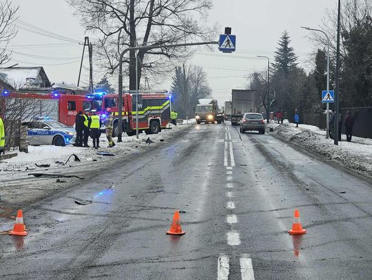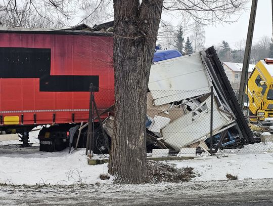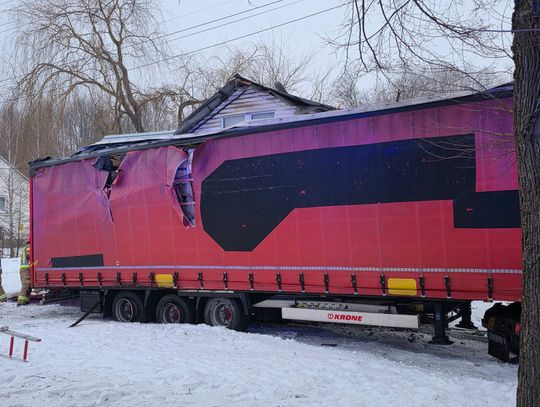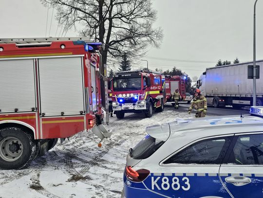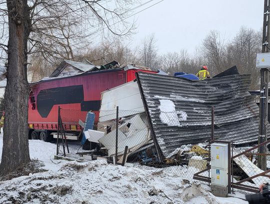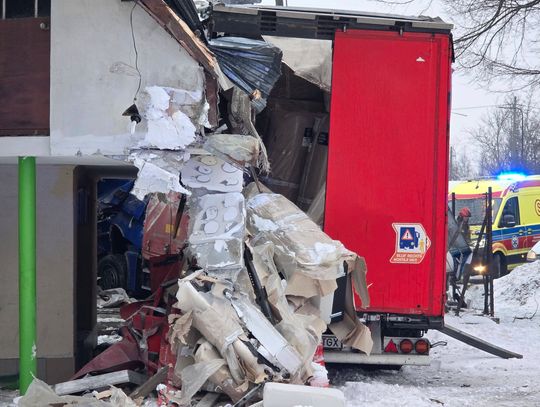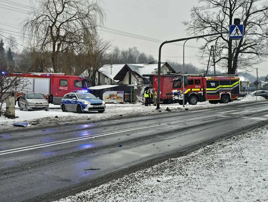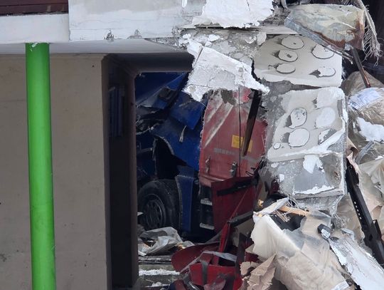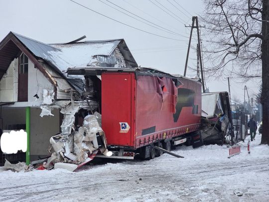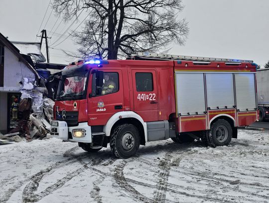 Jak wynika ze wstępnych informacji, samochód osobowy zderzył się z pojazdem ciężarowym. W wyniku uderzenia ciągnik siodłowy zjechał z jezdni, a następnie z impetem uderzył w budynek, powodując rozległe zniszczenia. W zdarzeniu są osoby poszkodowane.