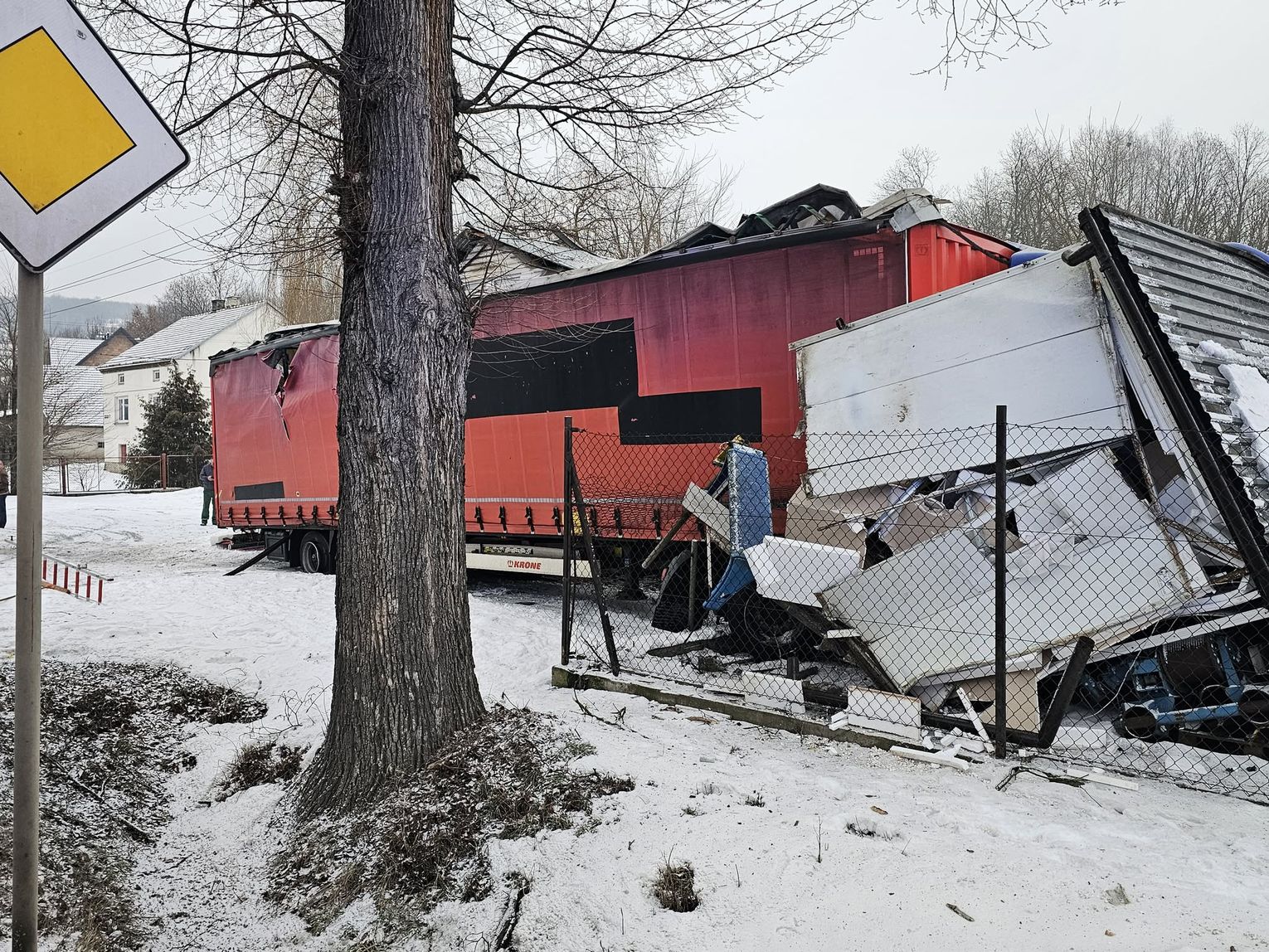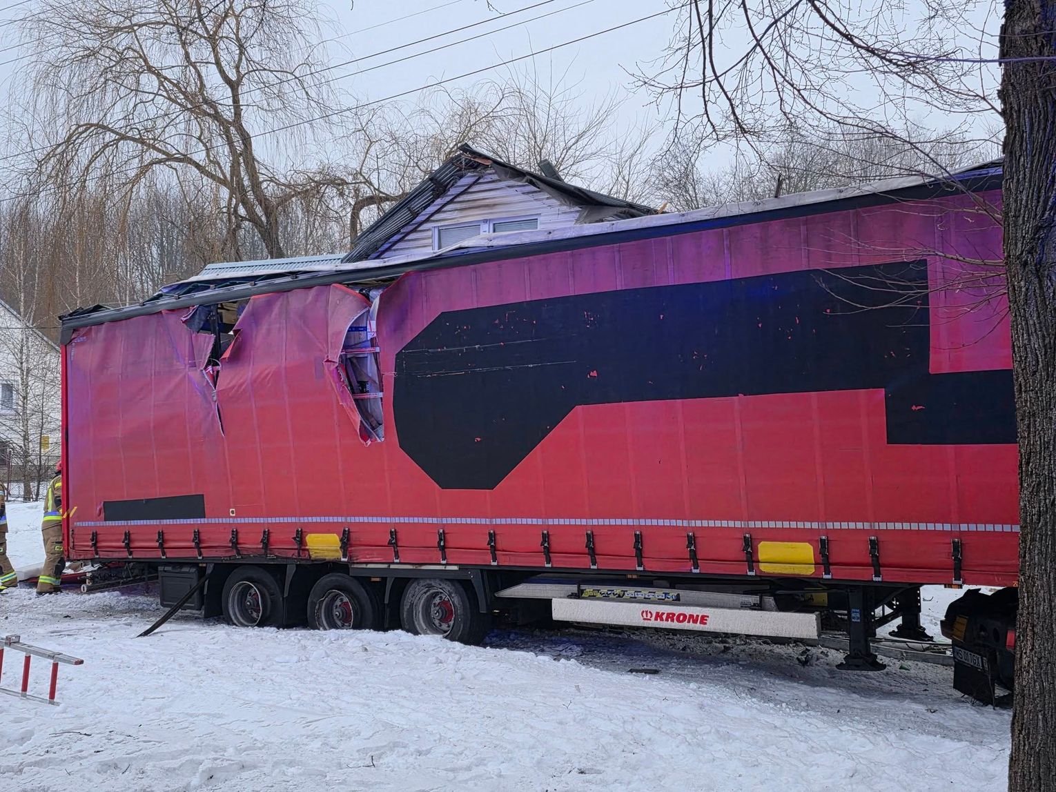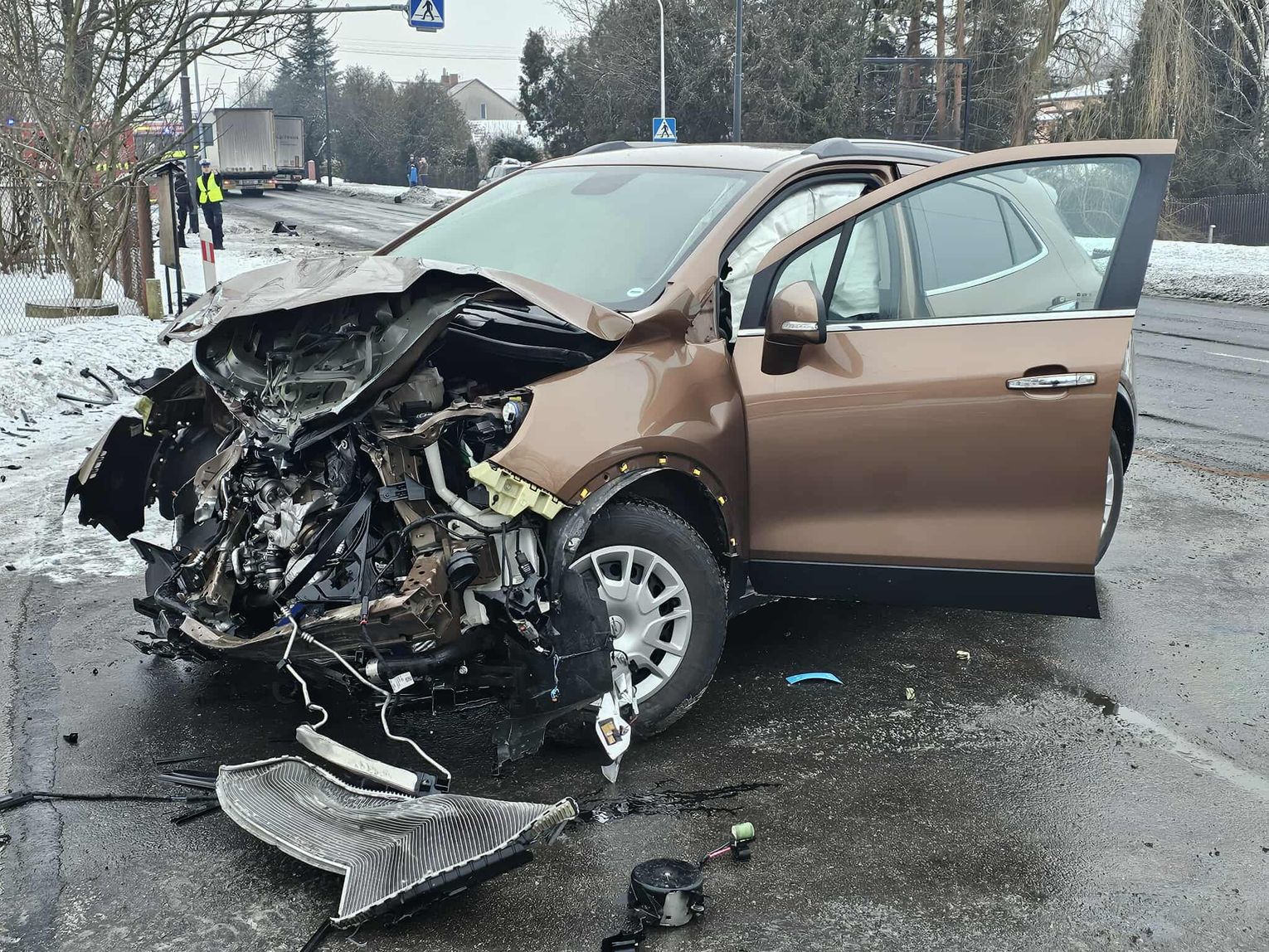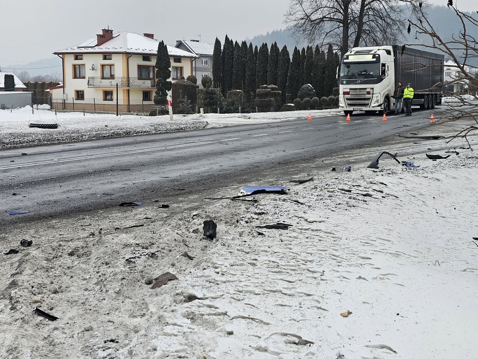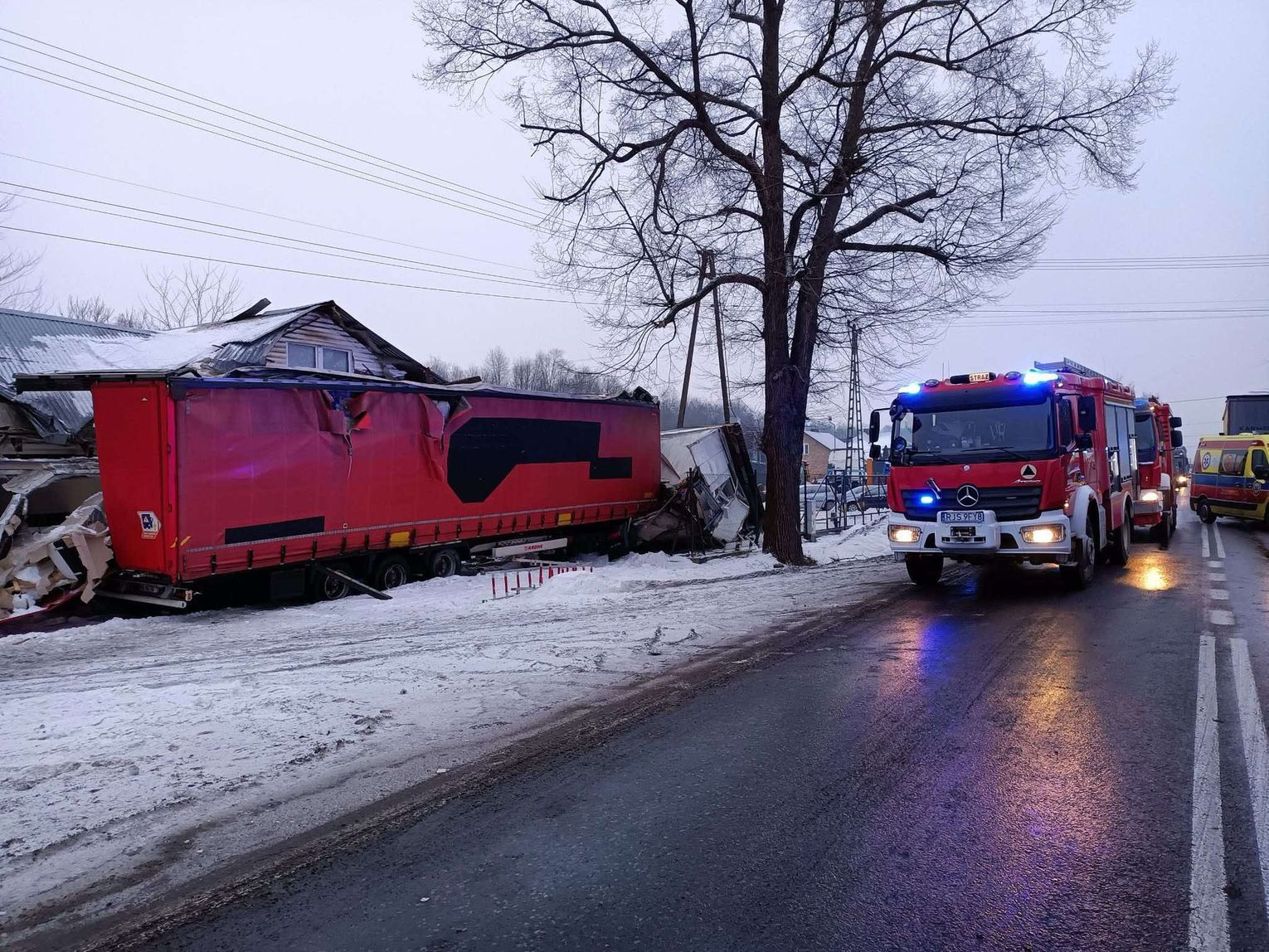 Jak wynika ze wstępnych informacji, samochód osobowy zderzył się z pojazdem ciężarowym. W wyniku uderzenia ciągnik siodłowy zjechał z jezdni, a następnie z impetem uderzył w budynek, powodując rozległe zniszczenia. W zdarzeniu są osoby poszkodowane.