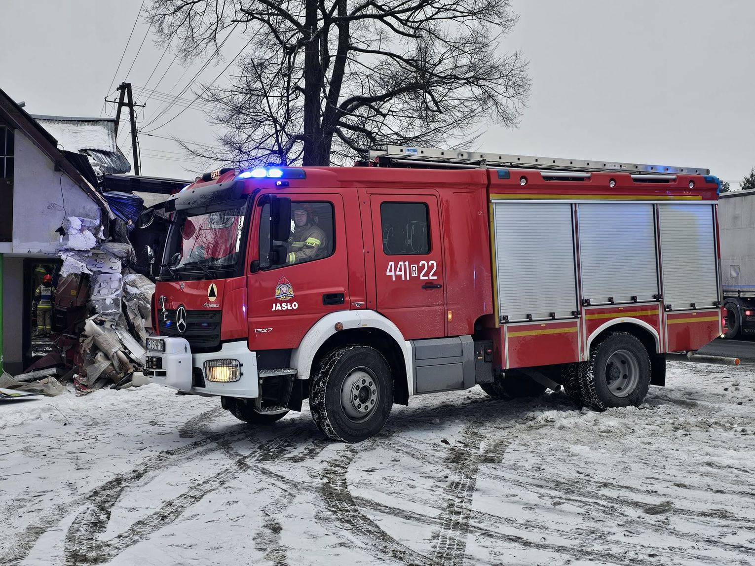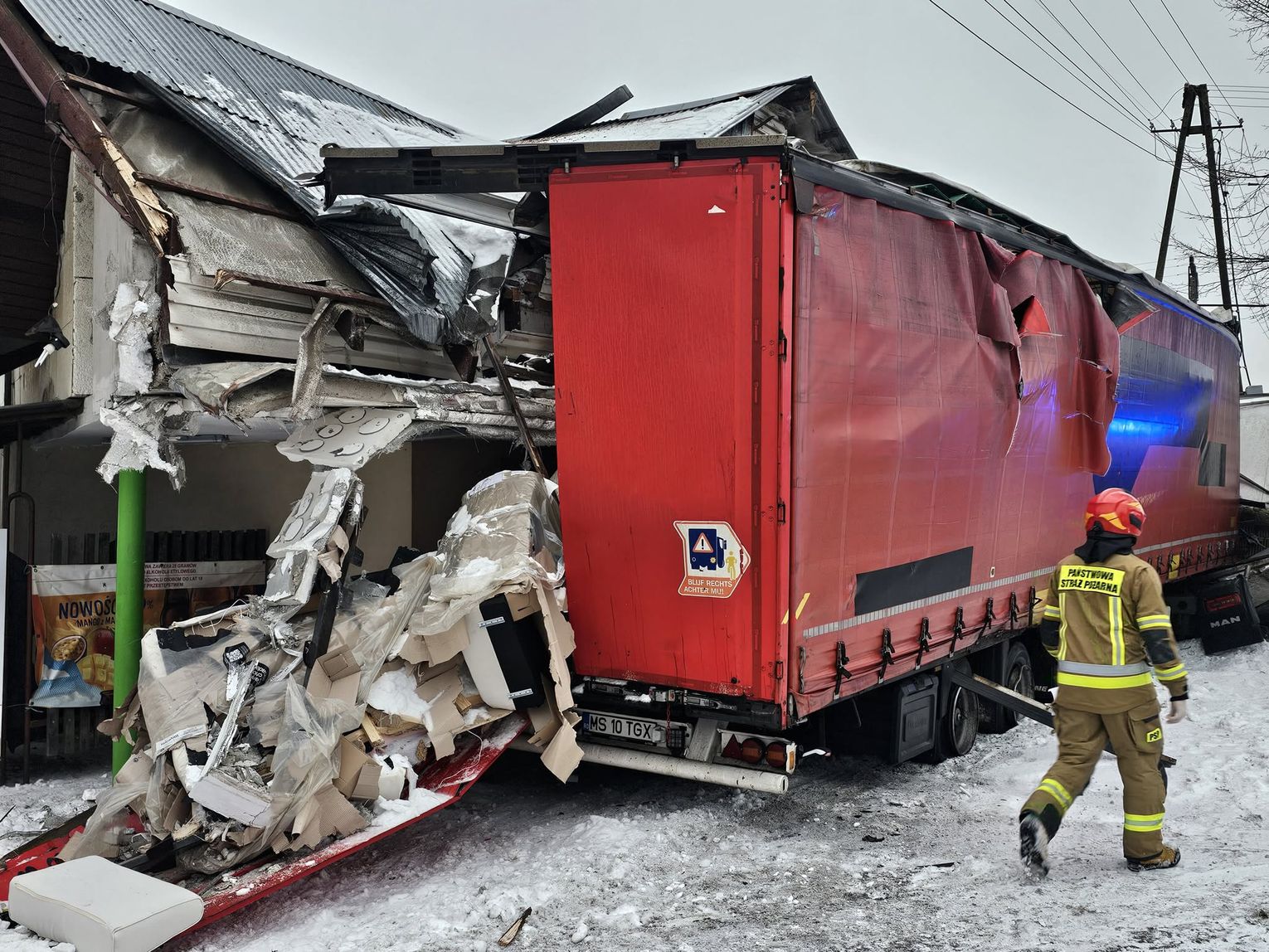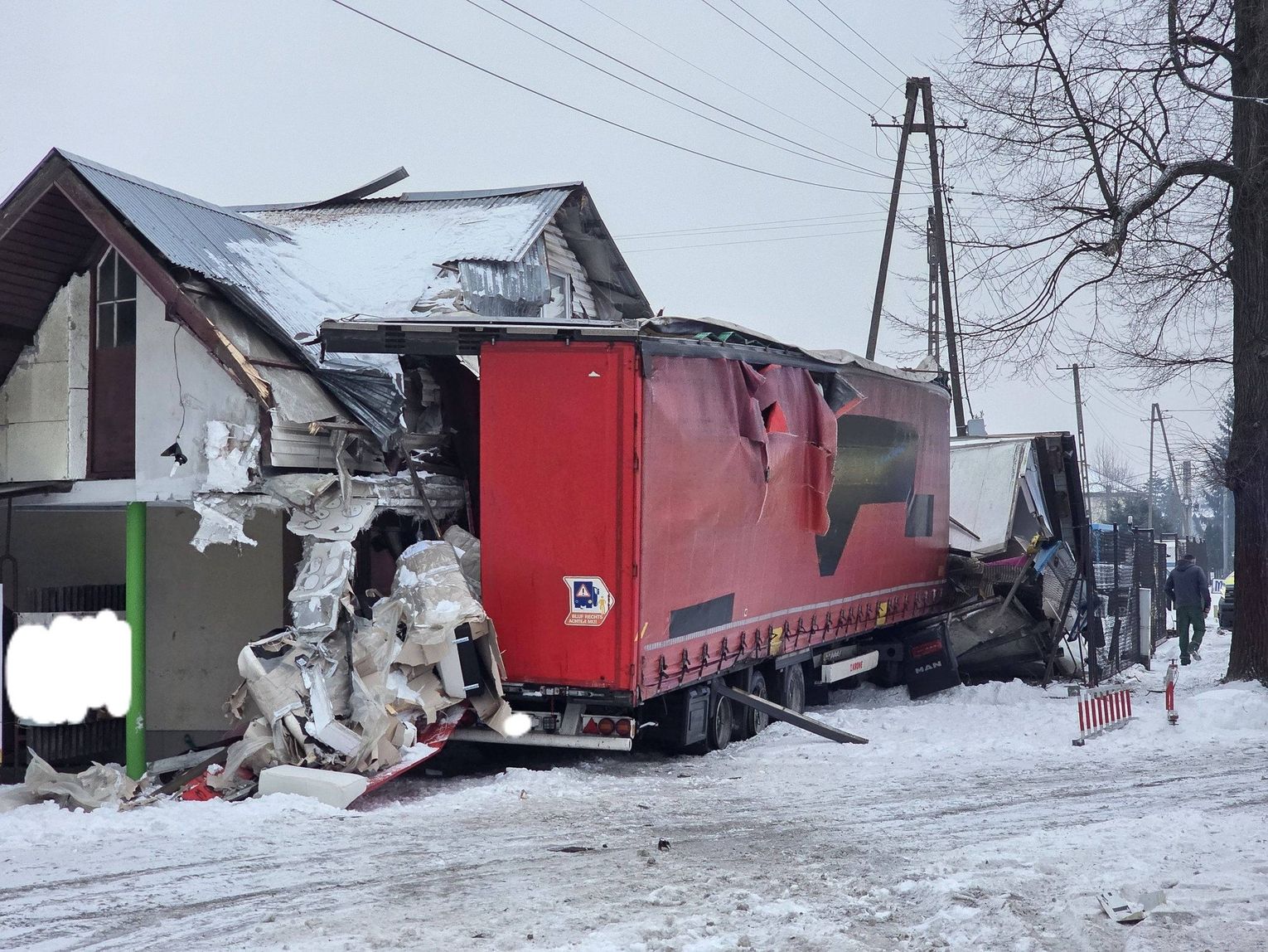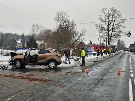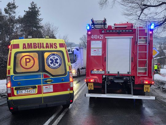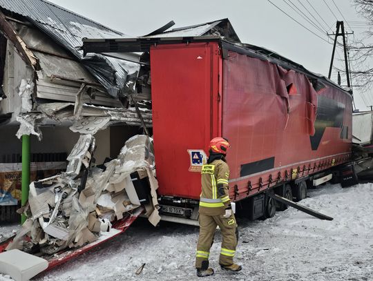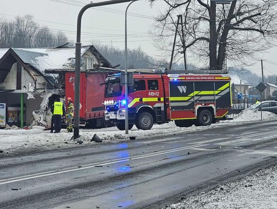 - Około godziny 7 na drodze krajowej nr 73 (ul. 17-stycznia w Jaśle) doszło do zderzenia trzech pojazdów. Z dotychczasowych ustaleń wynika, że kierujący ciężarowym Manem, obywatel Rumunii poruszając się w kierunku centrum Jasła, wyprzedzał na skrzyżowaniu inny pojazd ciężarowy marki Volvo, kierowanym przez obywatela Bułgarii. Podczas wykonywania tego manewru uderzył w stojącego na drodze podporządkowanej Opla, którym kierowała 61-latka, która oczekiwała na włączenie się do ruchu. Siła uderzenia była tak duża, że kierujący Manem stracił panowanie nad pojazdem, który ostatecznie wbił się w budynek sklepu. Na szczęście w środku nikogo nie było. Kierująca oplem została przewieziona do szpitala, natomiast kierujący Manem doznał tylko powierzchownych obrażeń i po przebadaniu przez medyków, pozostał na miejscu zdarzenia. Wszyscy uczestnicy byli trzeźwi. Policjanci prowadzą czynności wyjaśniające okoliczności zdarzenia, w związku z tym utrudnienia mogą potrwać do około godziny 10:30 - mówi podkom. Daniel Lelko z KPP w Jaśle.