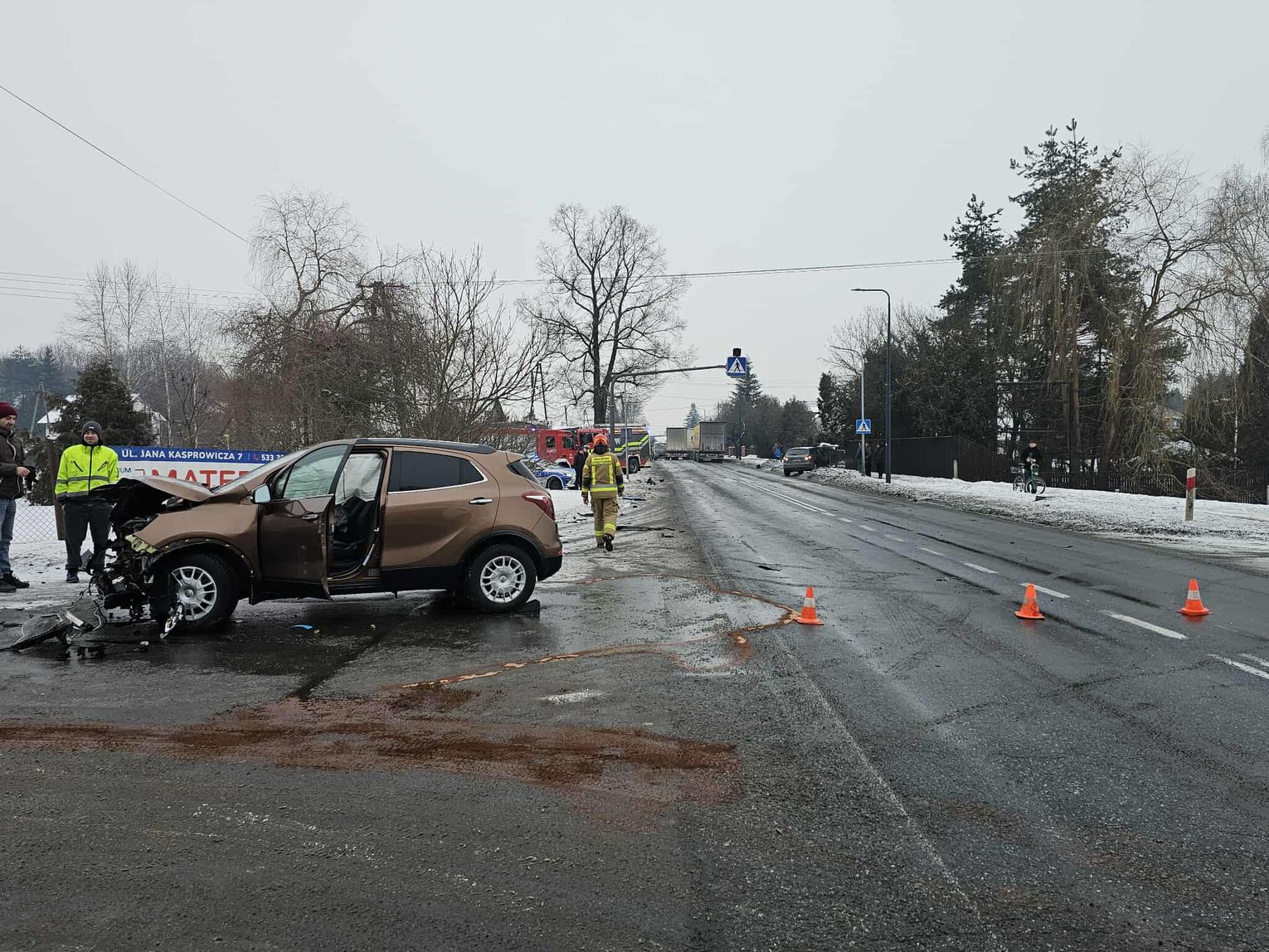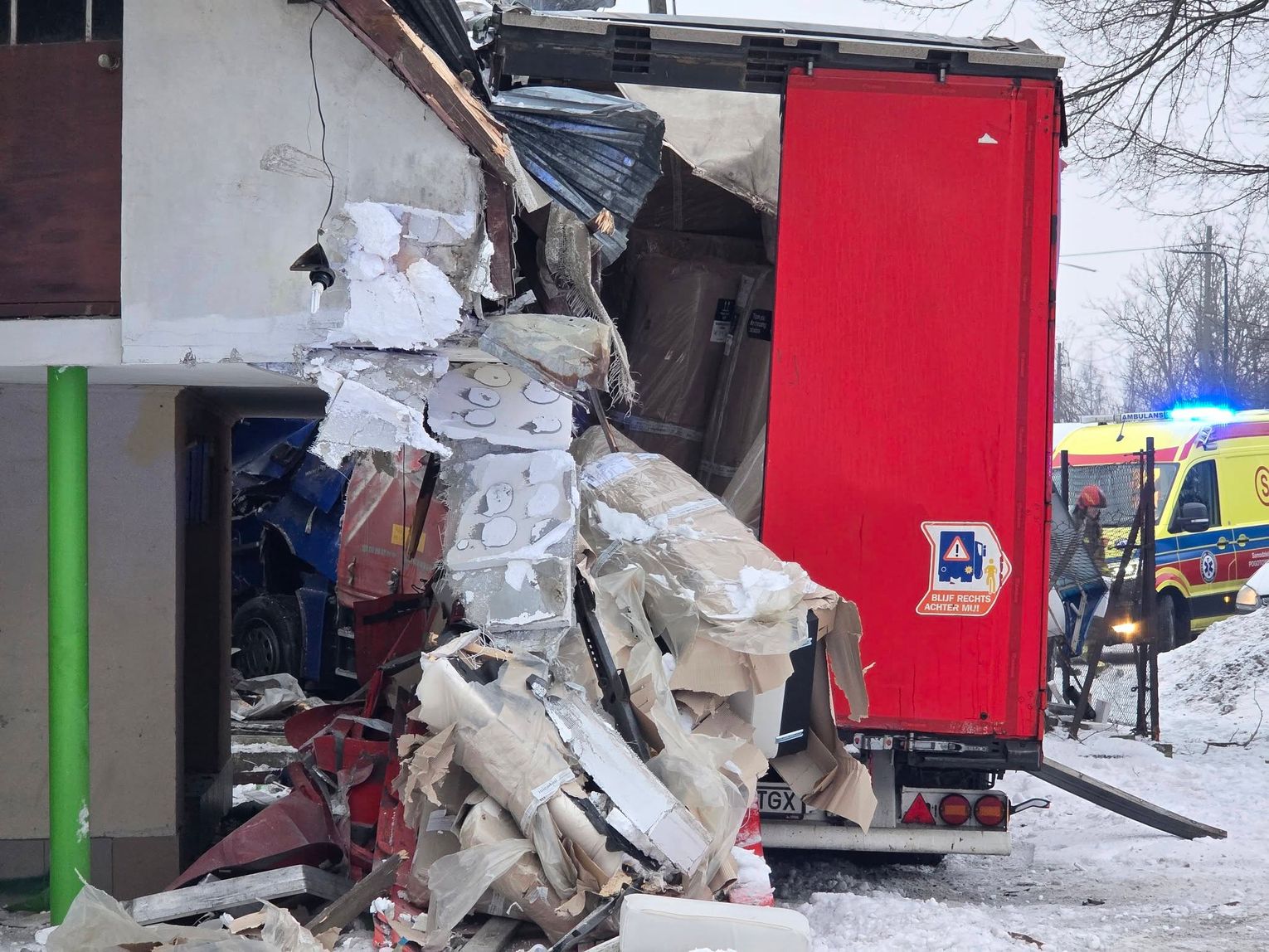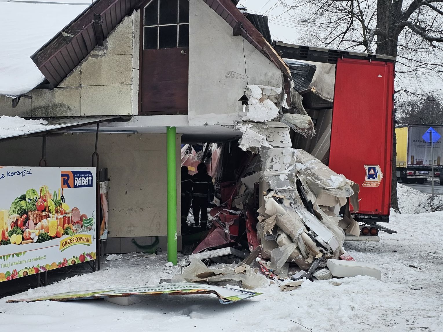 - Około godziny 7 na drodze krajowej nr 73 (ul. 17-stycznia w Jaśle) doszło do zderzenia trzech pojazdów. Z dotychczasowych ustaleń wynika, że kierujący ciężarowym Manem, obywatel Rumunii poruszając się w kierunku centrum Jasła, wyprzedzał na skrzyżowaniu inny pojazd ciężarowy marki Volvo, kierowanym przez obywatela Bułgarii. Podczas wykonywania tego manewru uderzył w stojącego na drodze podporządkowanej Opla, którym kierowała 61-latka, która oczekiwała na włączenie się do ruchu. Siła uderzenia była tak duża, że kierujący Manem stracił panowanie nad pojazdem, który ostatecznie wbił się w budynek sklepu. Na szczęście w środku nikogo nie było. Kierująca oplem została przewieziona do szpitala, natomiast kierujący Manem doznał tylko powierzchownych obrażeń i po przebadaniu przez medyków, pozostał na miejscu zdarzenia. Wszyscy uczestnicy byli trzeźwi. Policjanci prowadzą czynności wyjaśniające okoliczności zdarzenia, w związku z tym utrudnienia mogą potrwać do około godziny 10:30 - mówi podkom. Daniel Lelko z KPP w Jaśle.