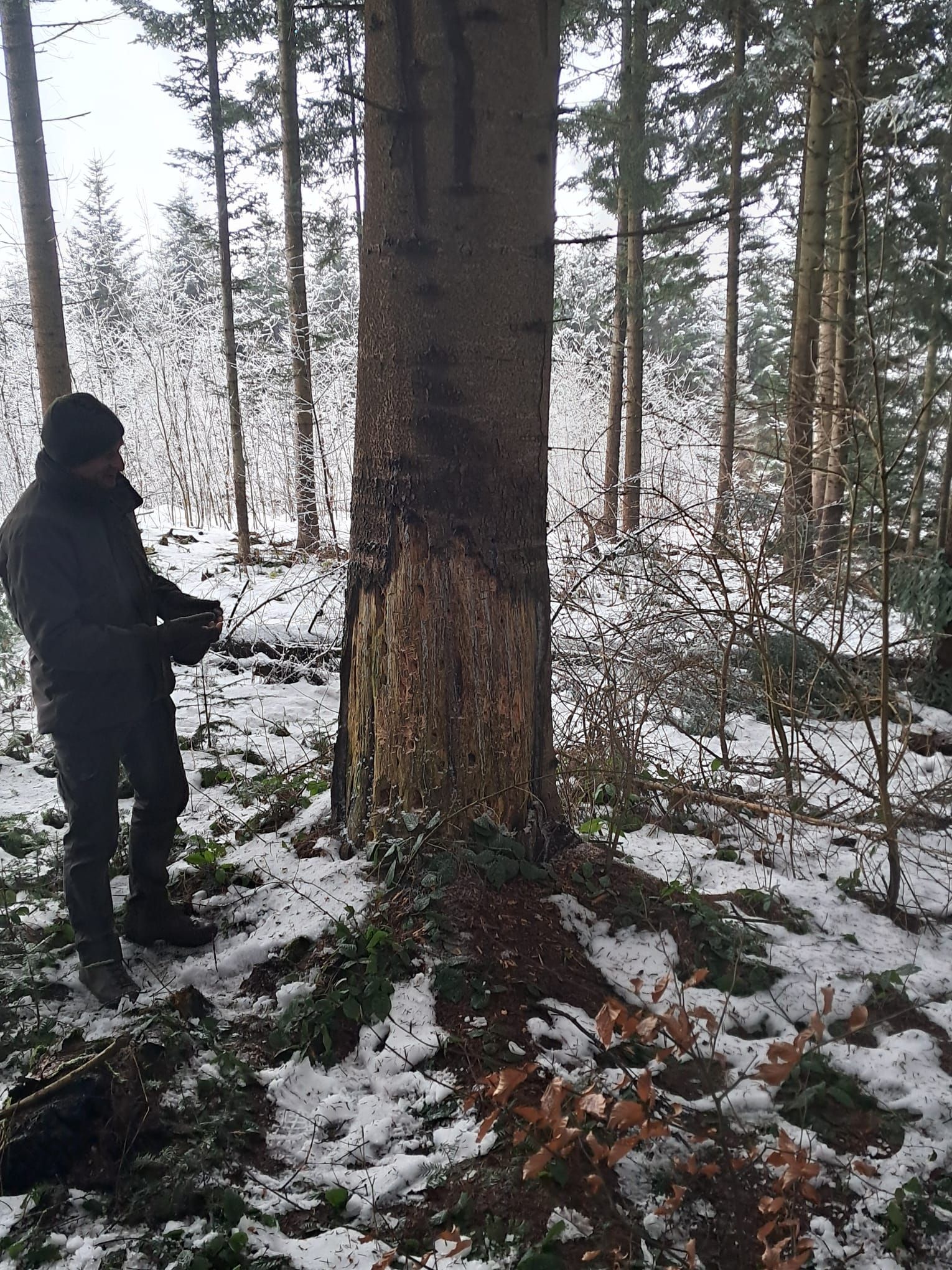 Magdalena Misiorowska z RDLP w Krośnie przekazuje, że ważnym elementem wizyty terenowej była prezentacja szkód w ekosystemach leśnych. Zdzieranie kory z jodeł przez niedźwiedzie w okresie wegetacyjnym stanowi istotny problem hodowlany i sanitarny bieszczadzkich drzewostanów. Powstałe w ten sposób uszkodzenia mechaniczne pni stają się drogą infekcji dla patogenów grzybowych, co w konsekwencji w skrajnych przypadkach prowadzi do zamierania całych drzew.