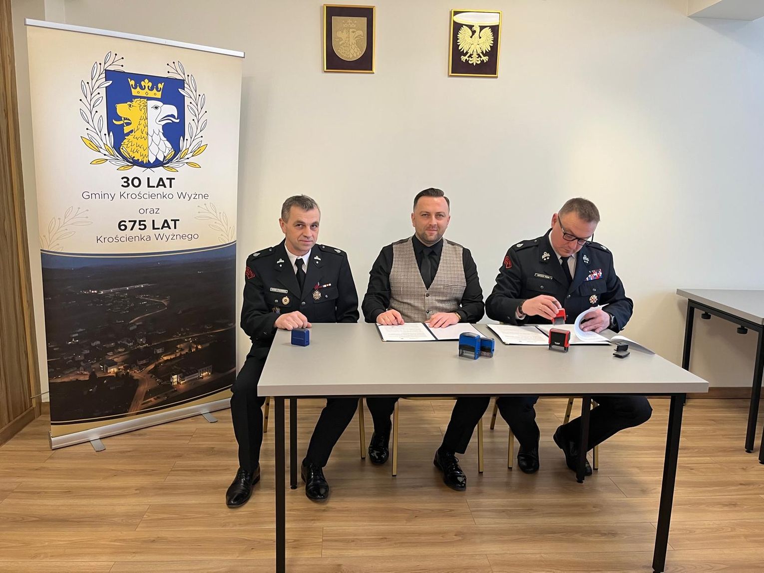 W uroczystym przekazaniu sprzętu uczestniczyli przedstawiciele obu jednostek: prezes OSP Krościenko Wyżne Andrzej Glazar wraz ze skarbnik Agnieszką Glazar oraz prezes OSP Pustyny Krzysztof Podkul w towarzystwie skarbnika Marcina Zygarowicza. Nowe wyposażenie to istotne wsparcie dla strażaków ochotników, którzy na co dzień dbają o bezpieczeństwo lokalnej społeczności.