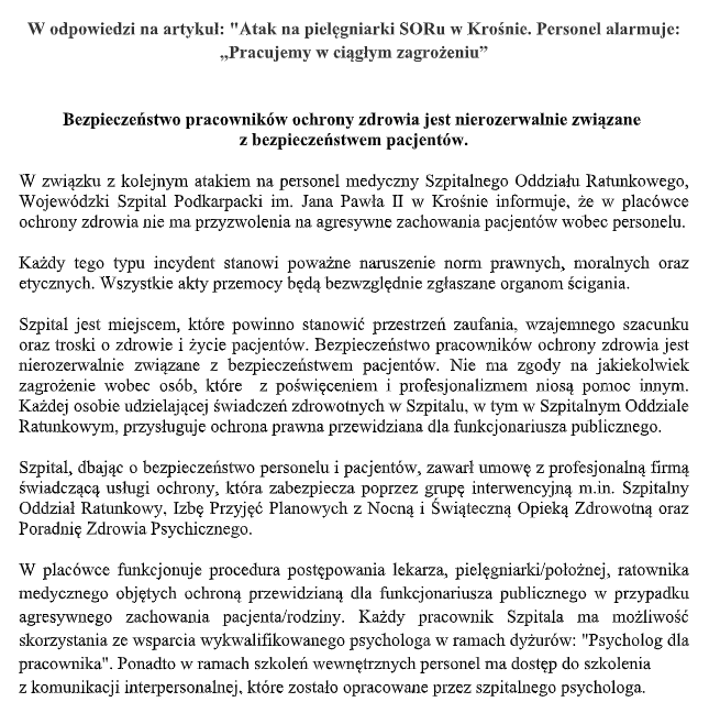 Pełna treść informacji krośnieńskiego szpitala: