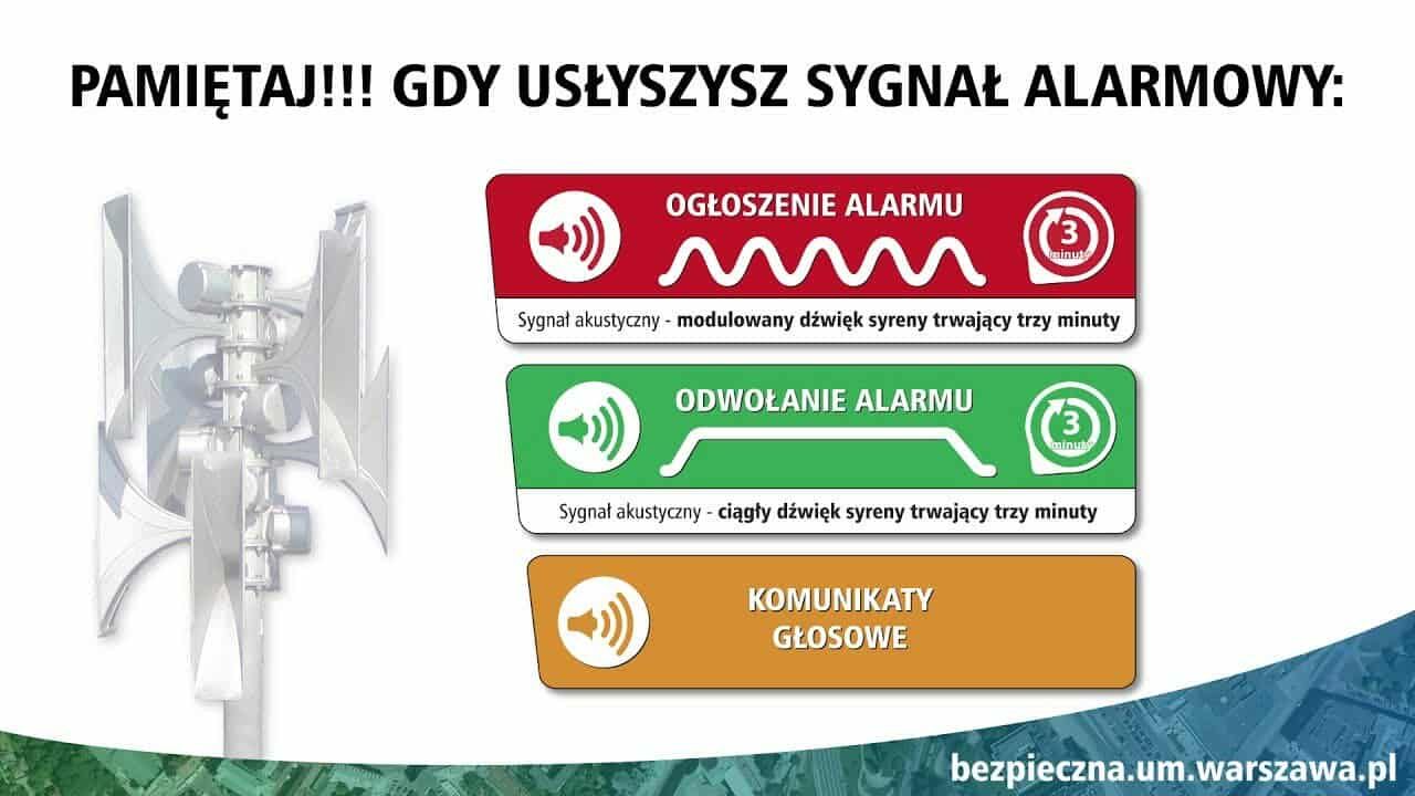 Podstawową formą ostrzegania ludności jest sygnał akustyczny syreny alarmowej. Alarm dla ludności cywilnej ogłasza modulowany dźwięk syreny trwający trzy minuty.