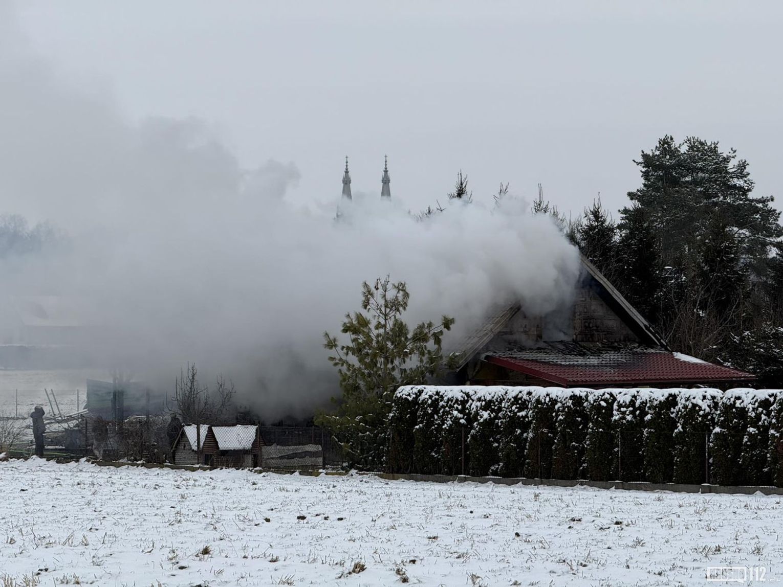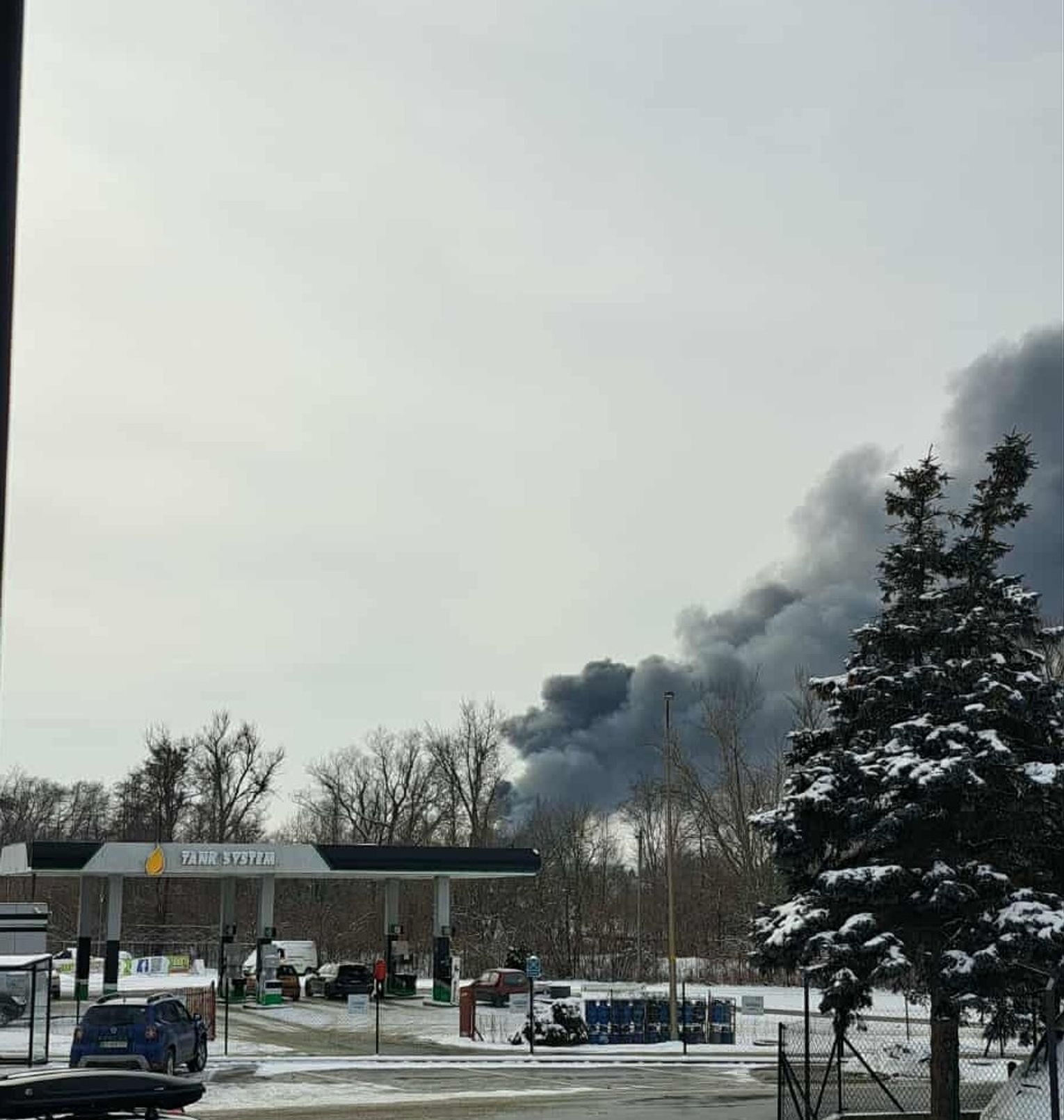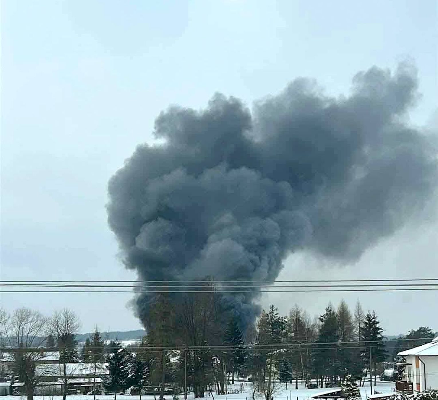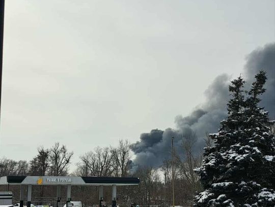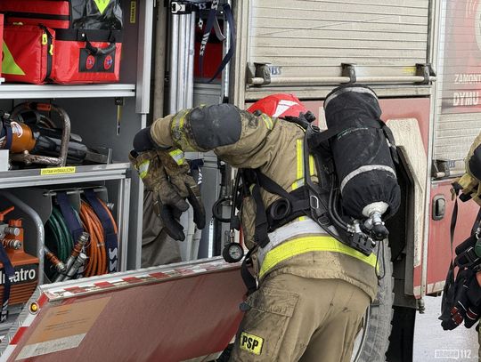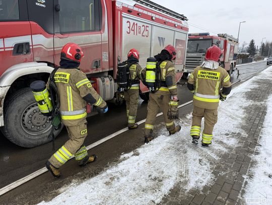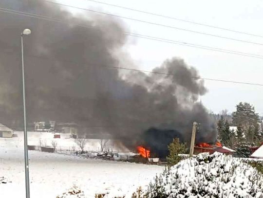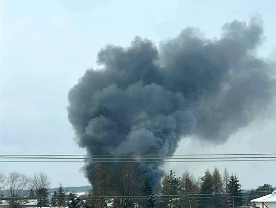 Gęsty, czarny dym widoczny był z kilku kilometrów. Obecnie trwa akcja gaśnicza, w której bierze udział wielu strażaków PSP i OSP.