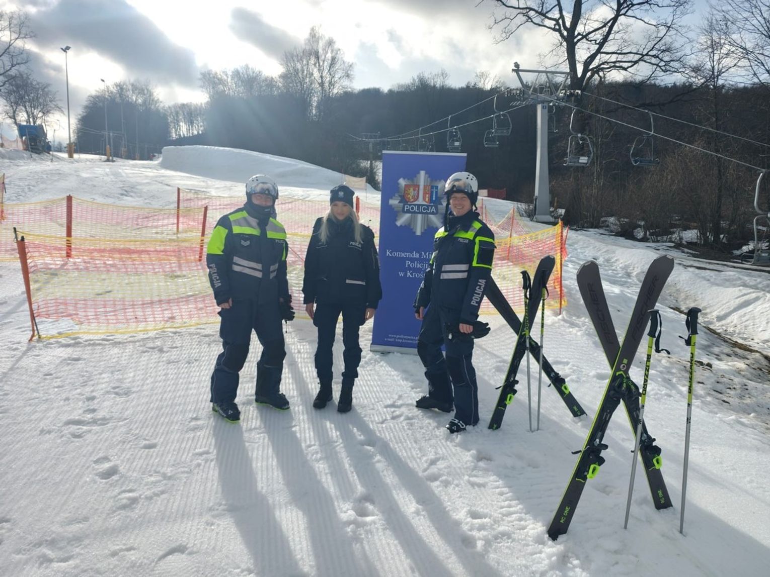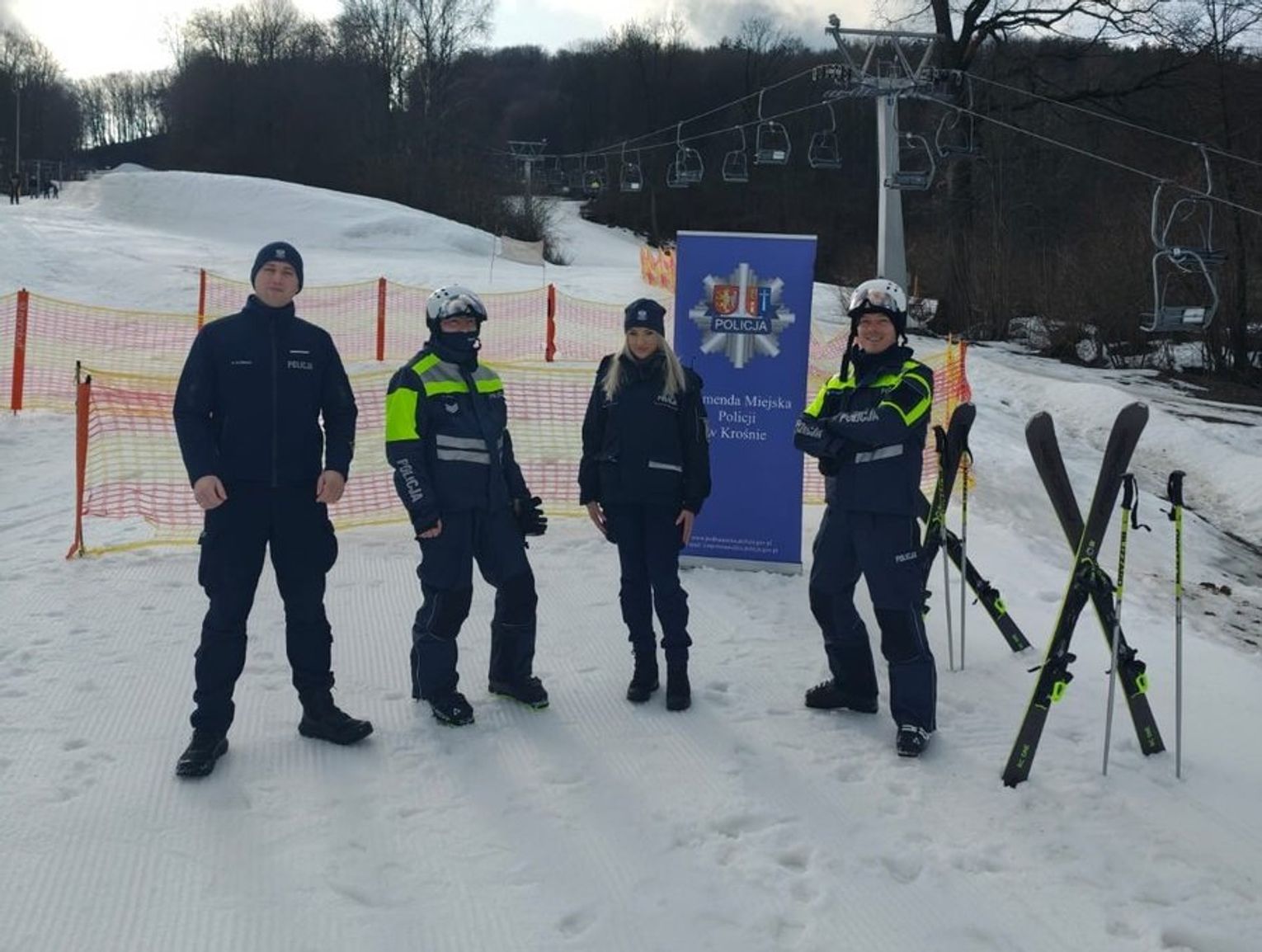 W dniach 13 i 14 lutego na stoku pojawili się funkcjonariusze, którzy połączyli profilaktykę z dobrą zabawą. Krośnieńscy profilaktycy – st. post. Adrian Kuźniar i sierż. Weronika Chentosz-Kozerska – wraz z rymanowskim dzielnicowym asp. Damianem Walusem prowadzili działania skierowane do osób korzystających z tras zjazdowych.