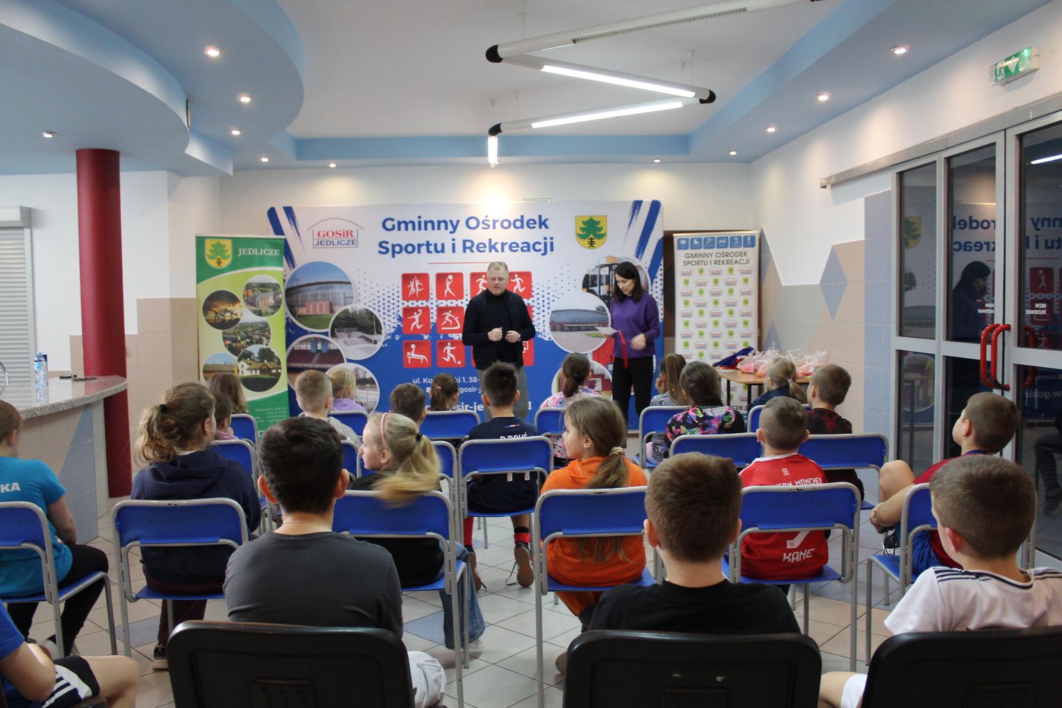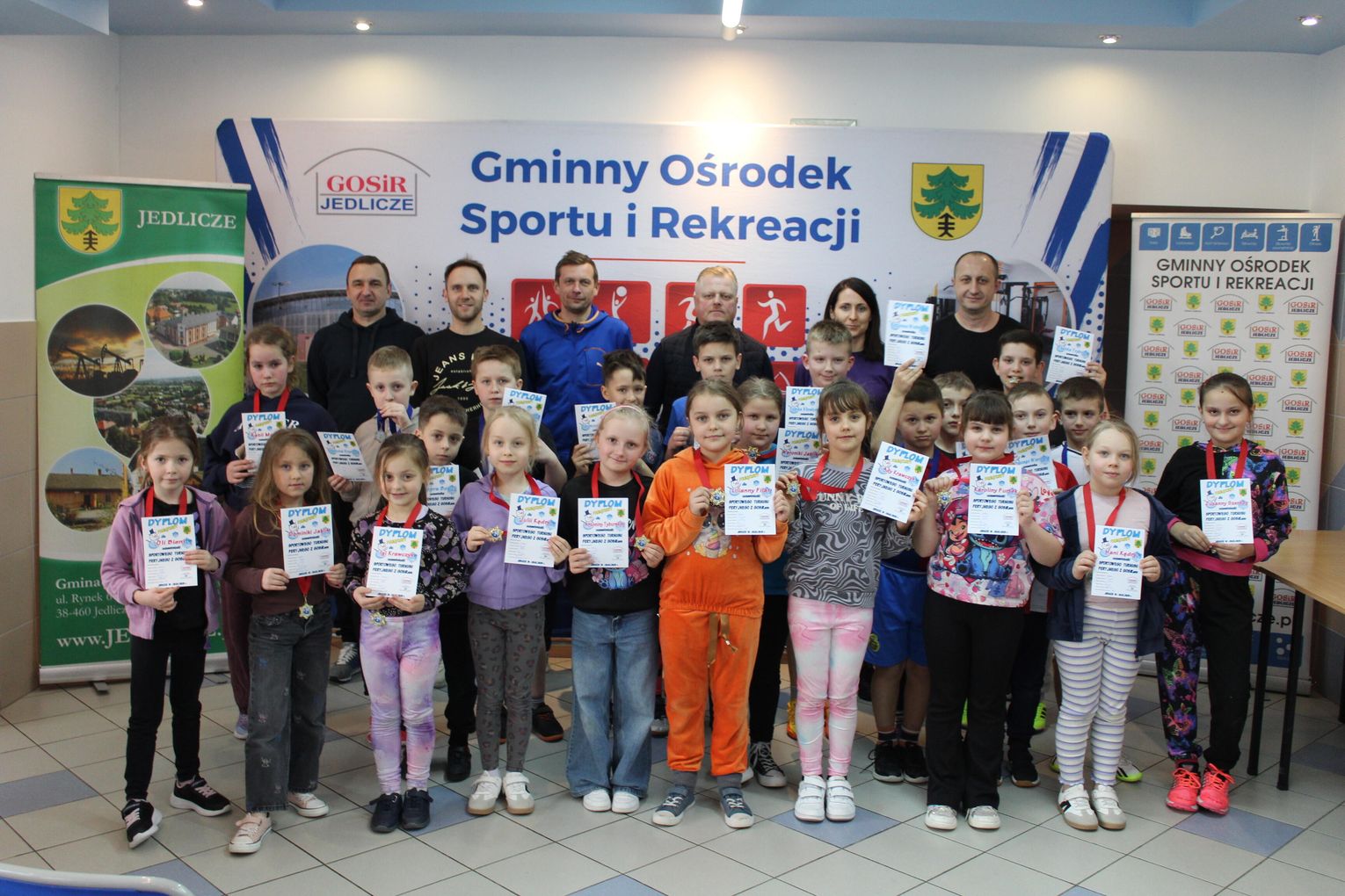 Grupa 24 chłopców i dziewczynek z klas I-IV szkół podstawowych z terenu gminy Jedlicze podczas pięciu dni turnusu uczestniczyła w zajęciach sportowych zorganizowanych przez GOSiR w Jedliczu, w ramach sportowych ferii zimowych. Zajęcia odbywały się pod okiem instruktorów GOSiR na obiektach ośrodka.