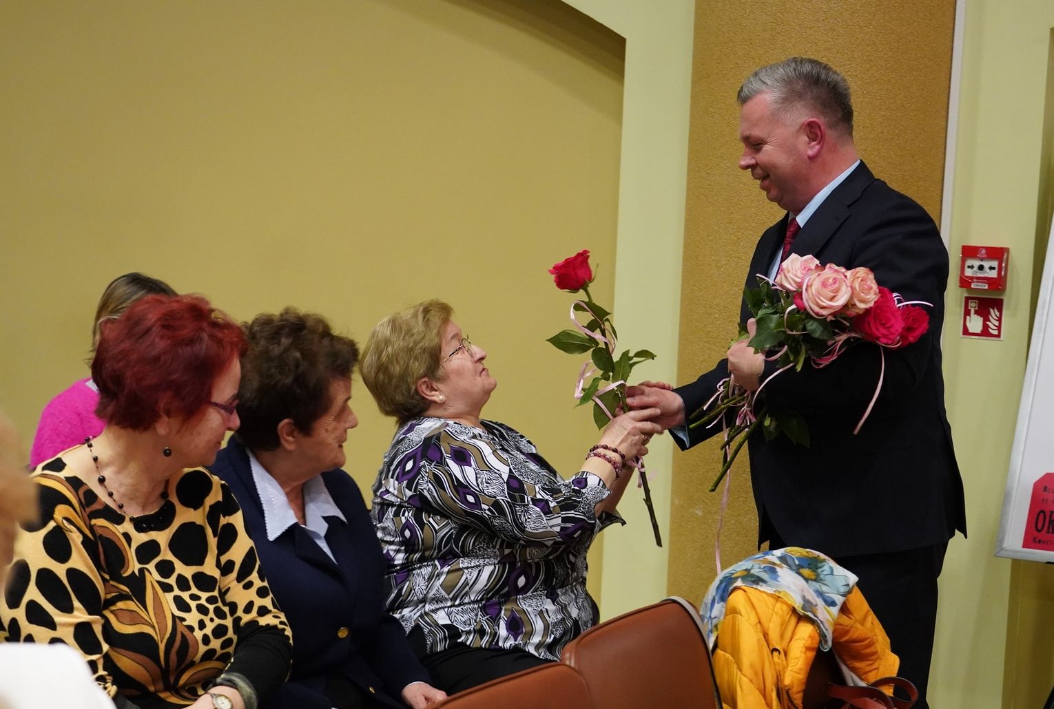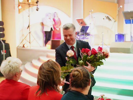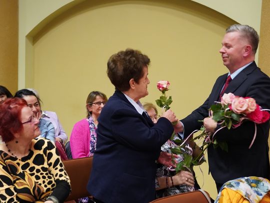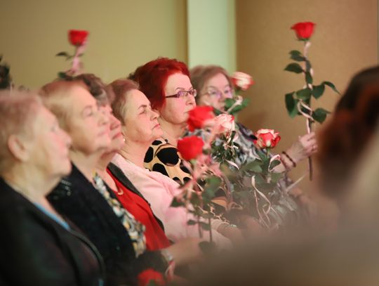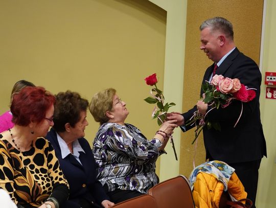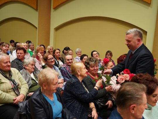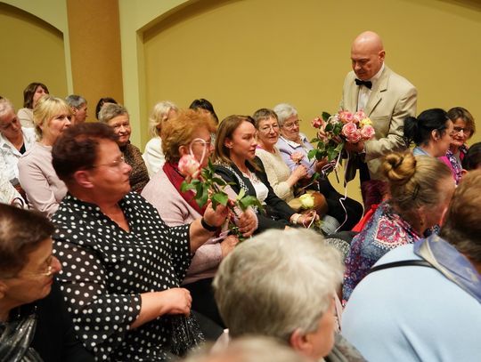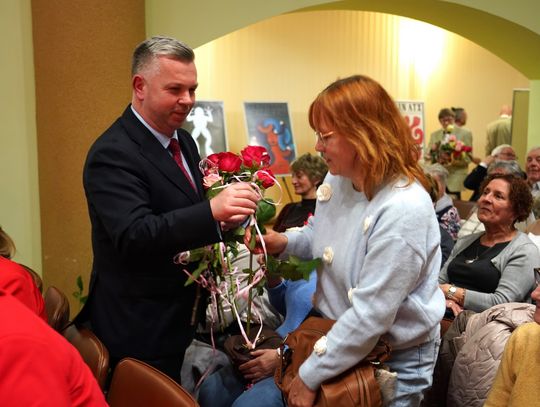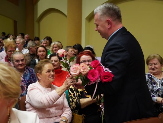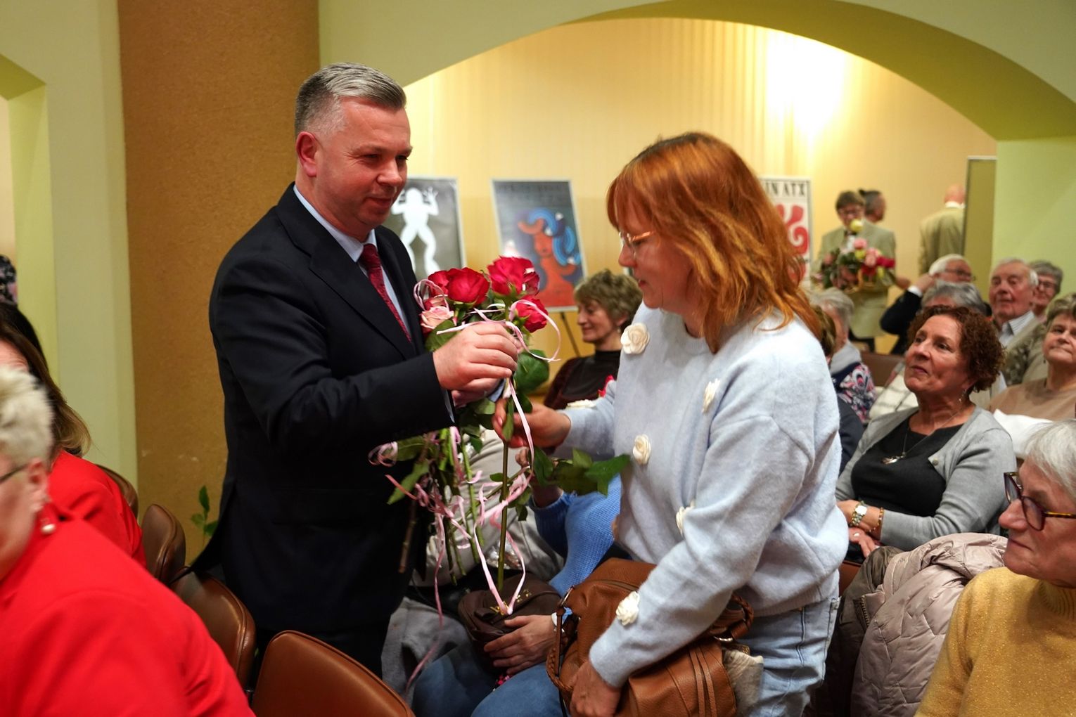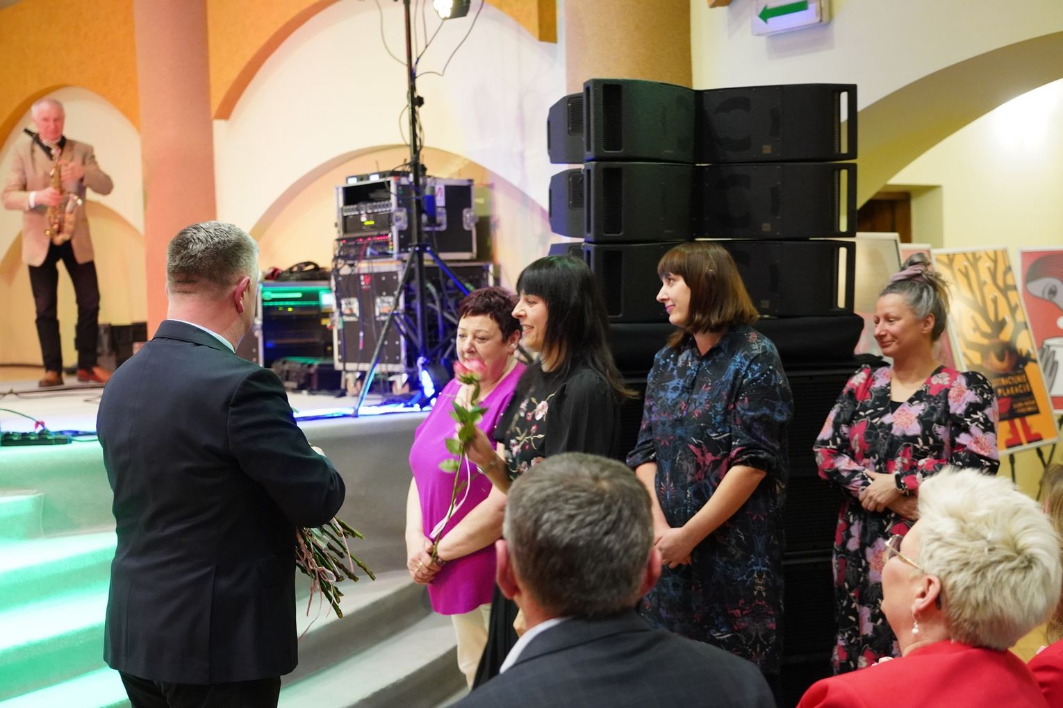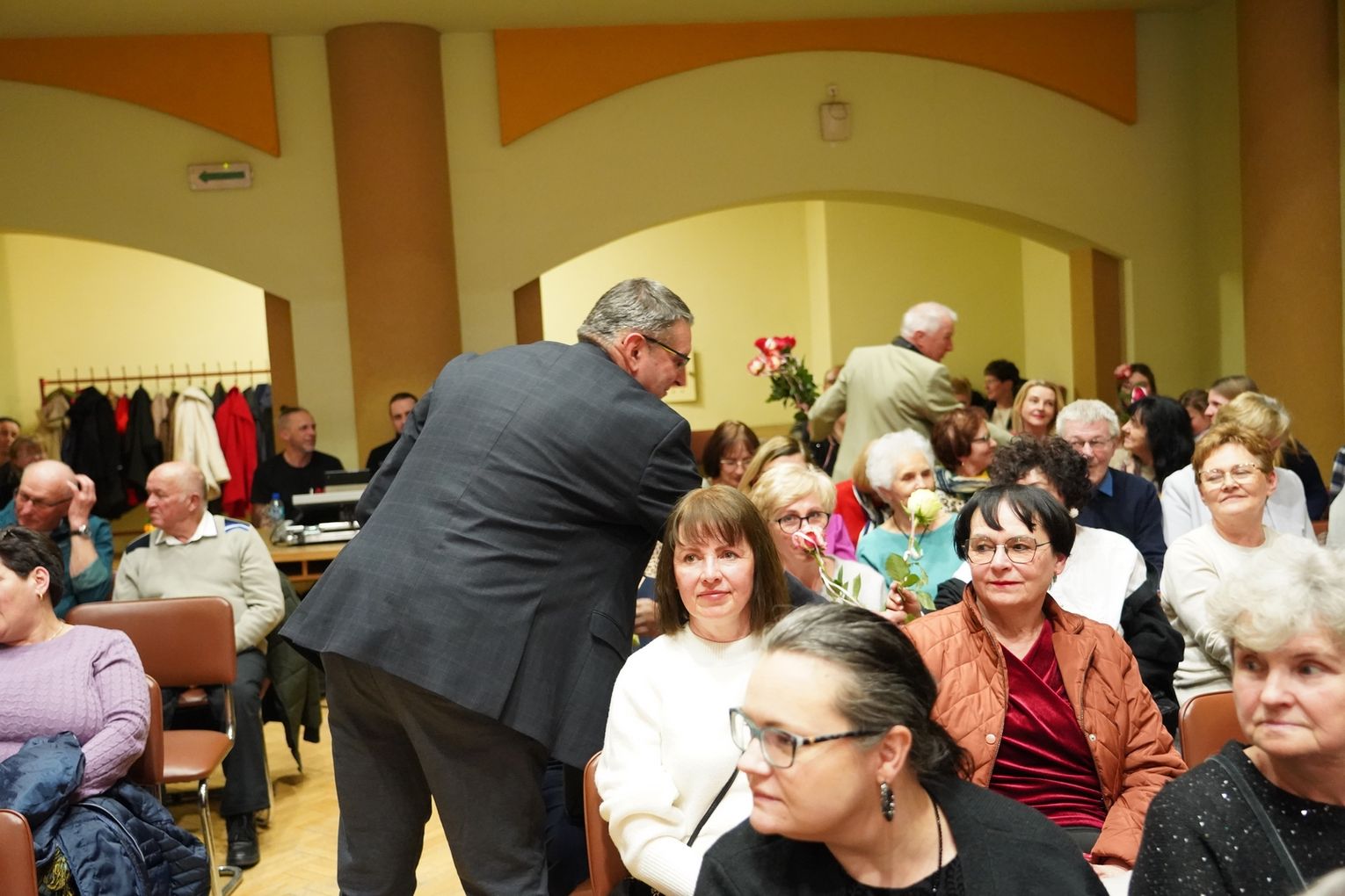 Nie zabrakło również ciepłych słów skierowanych do wszystkich pań obecnych na sali. Burmistrz, w towarzystwie radnego Wojciech Uram oraz muzyków zespołu, wręczył kobietom kwiaty, podkreślając świąteczny charakter spotkania.