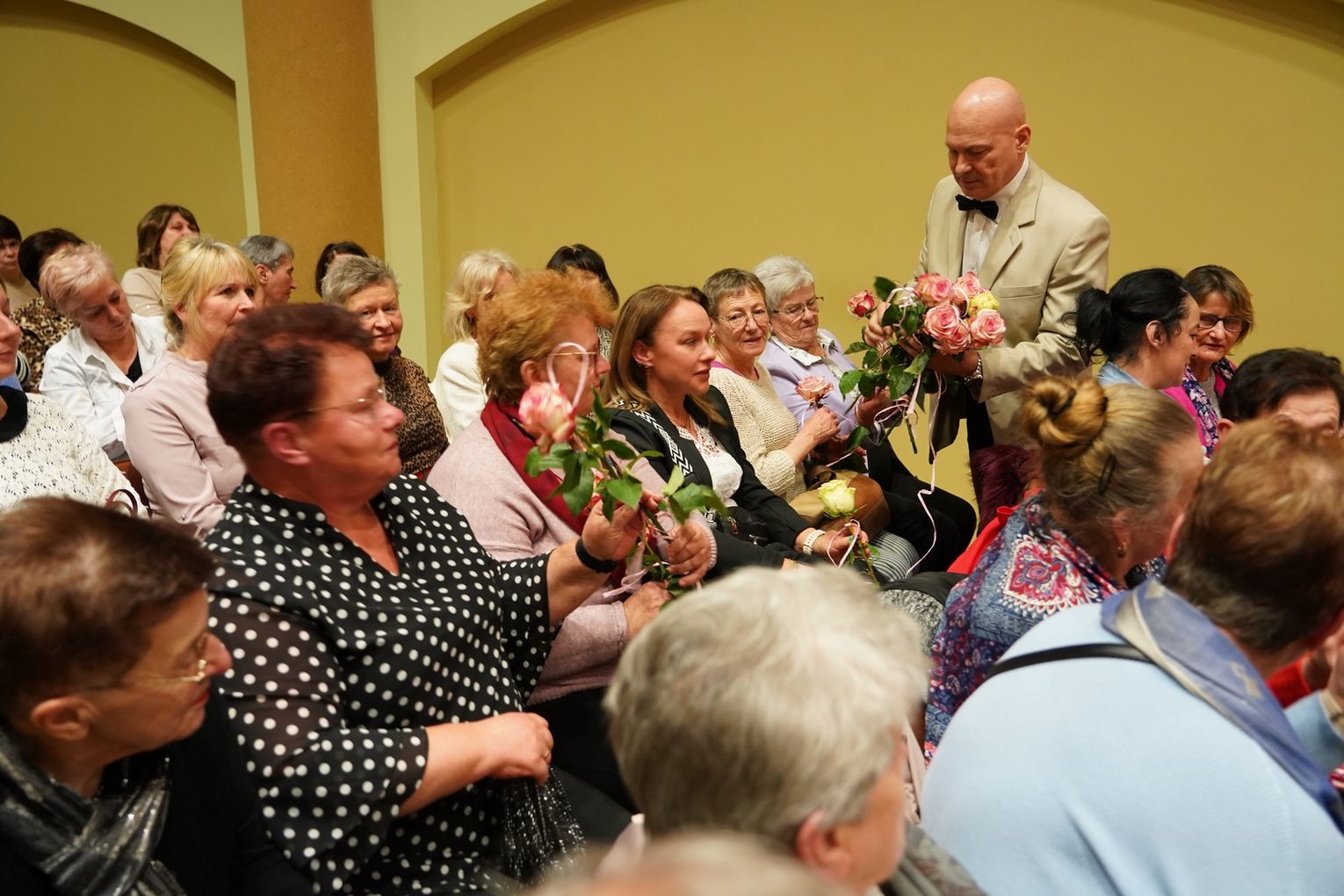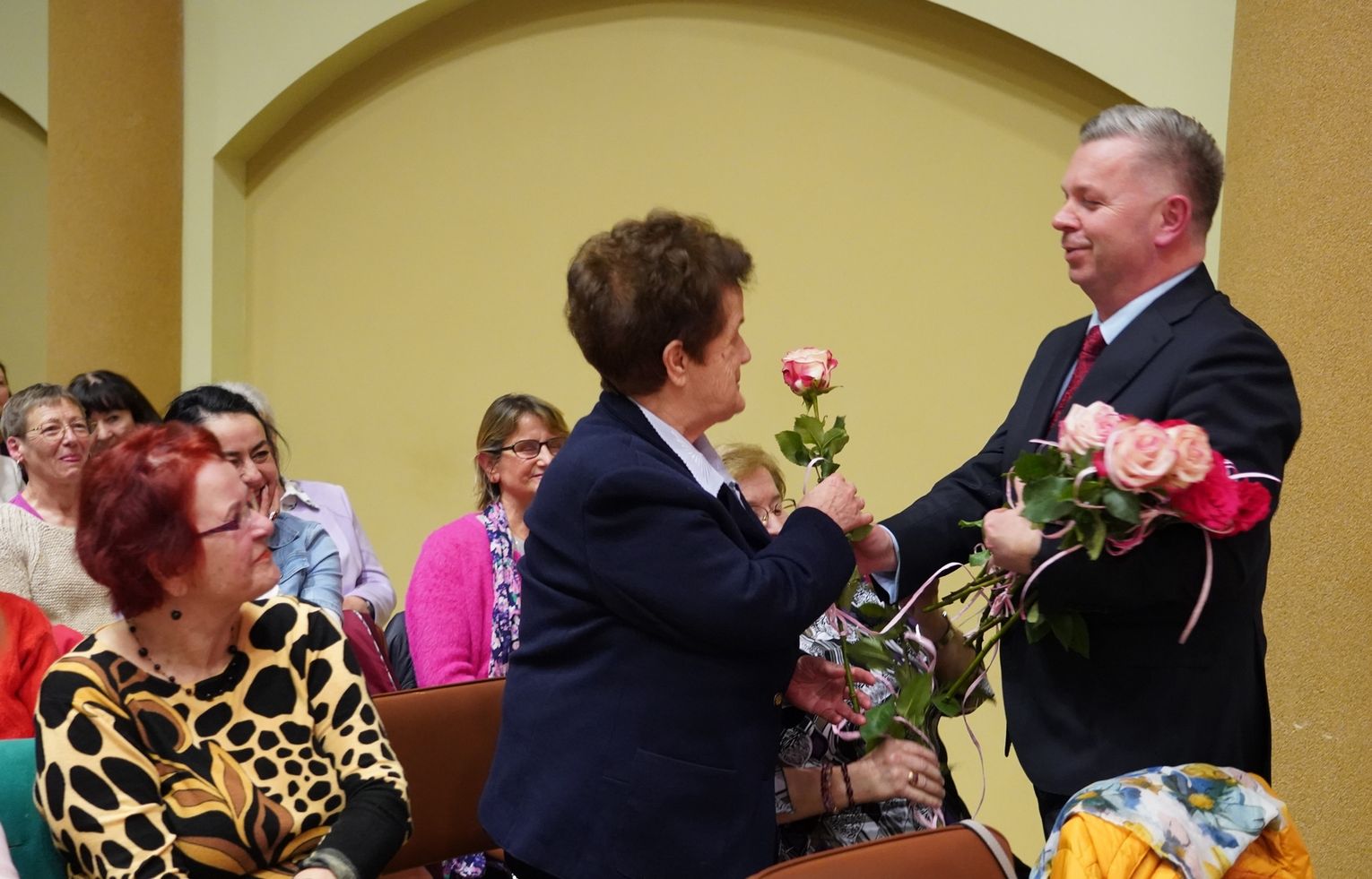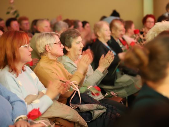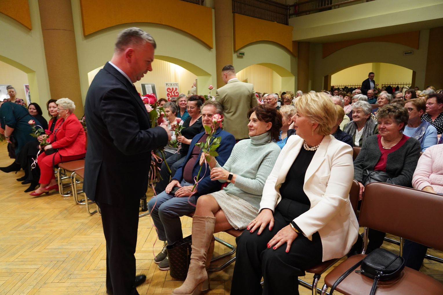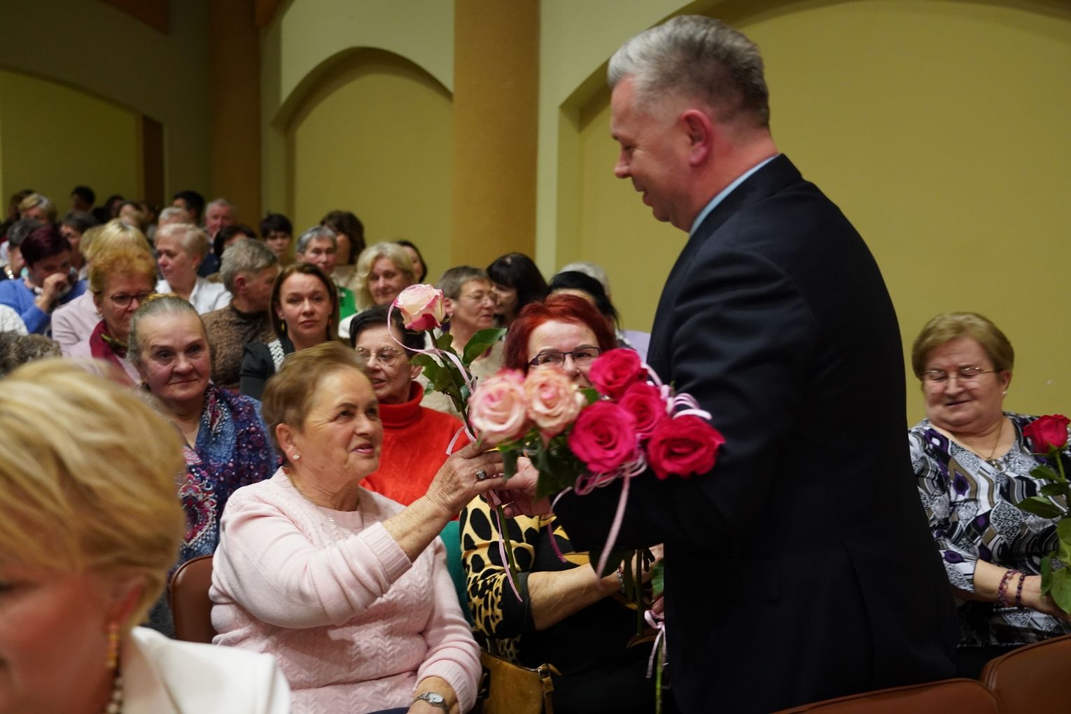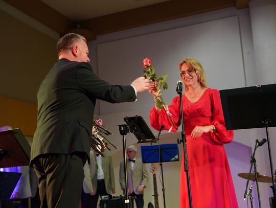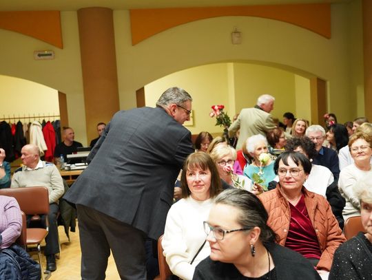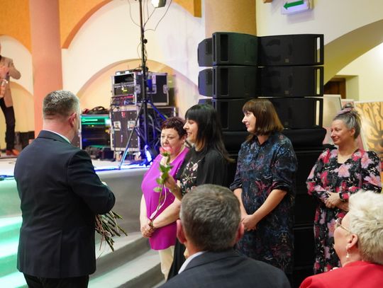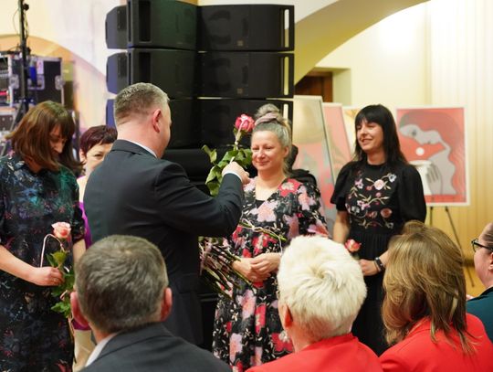 Nie zabrakło również ciepłych słów skierowanych do wszystkich pań obecnych na sali. Burmistrz, w towarzystwie radnego Wojciech Uram oraz muzyków zespołu, wręczył kobietom kwiaty, podkreślając świąteczny charakter spotkania.