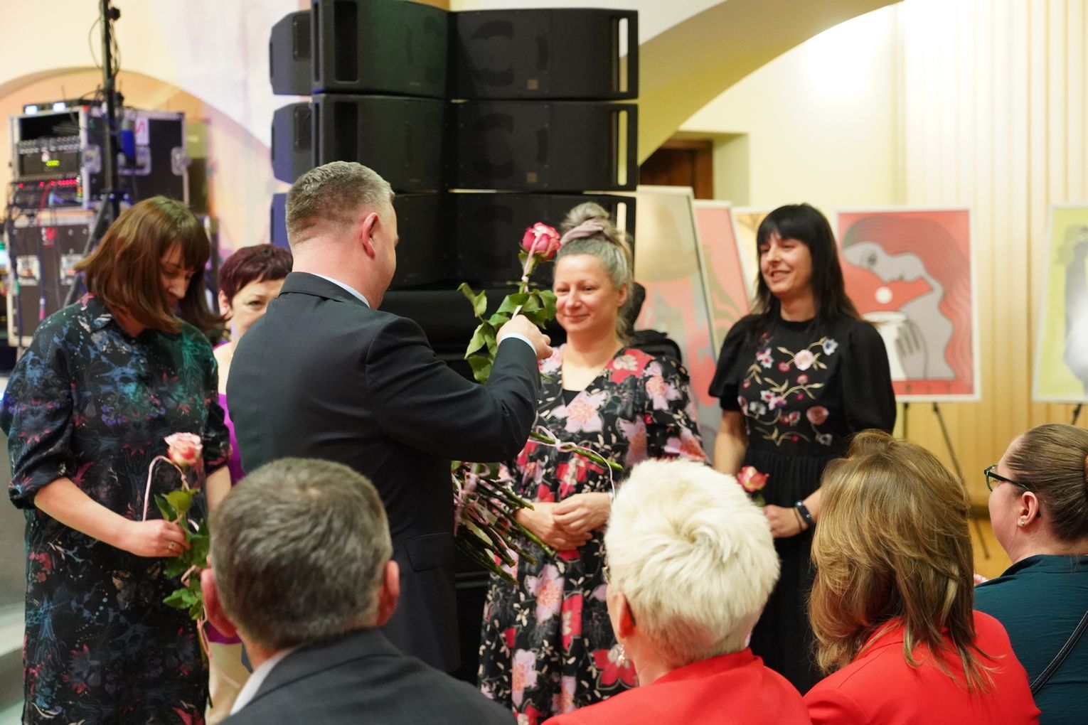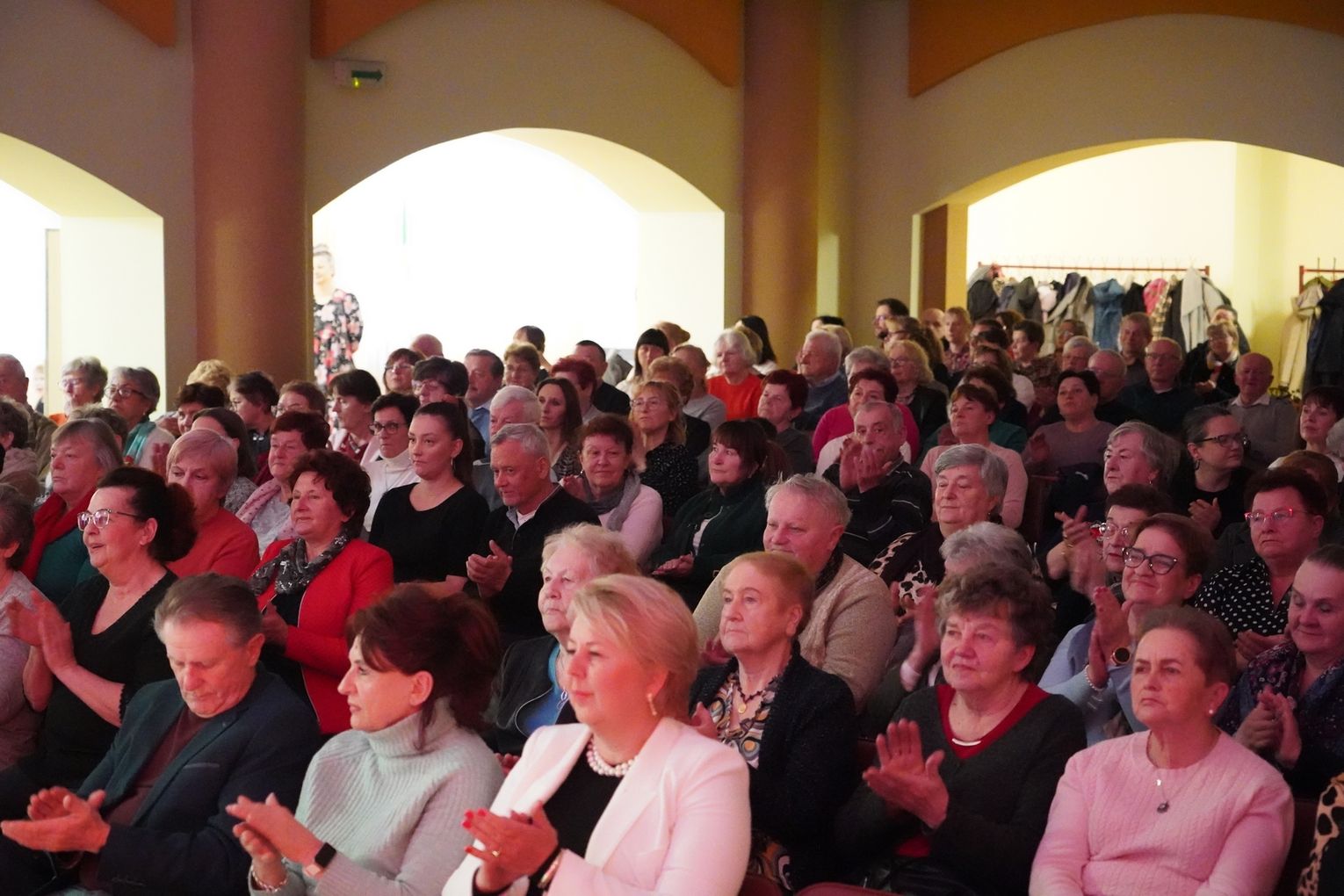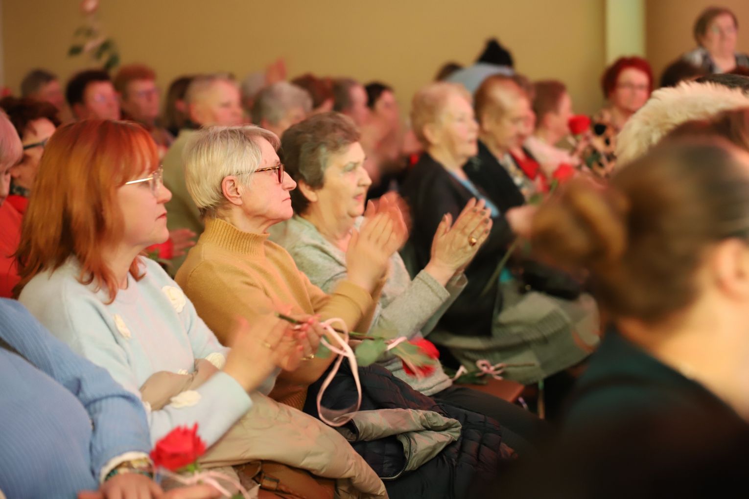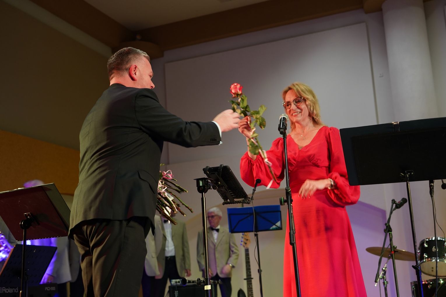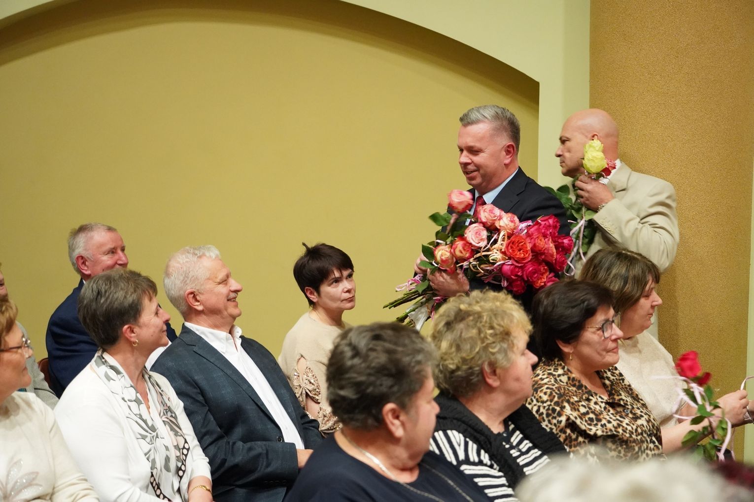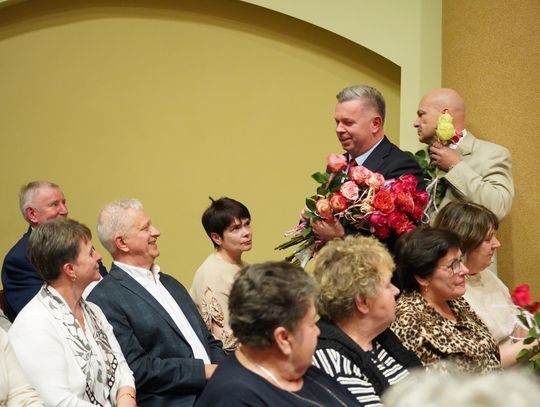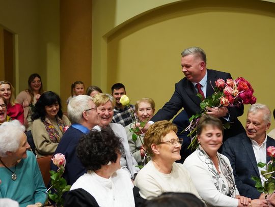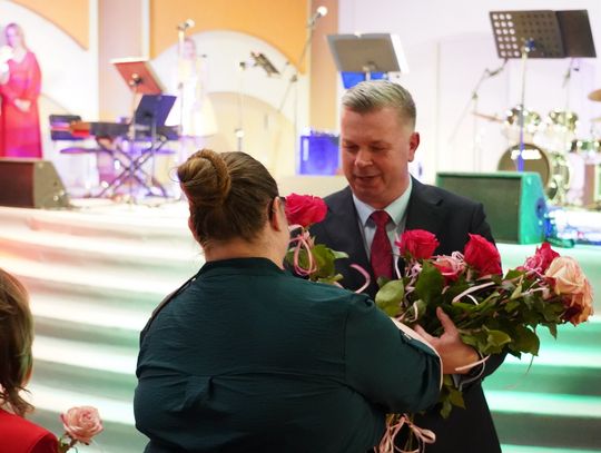 Nie zabrakło również ciepłych słów skierowanych do wszystkich pań obecnych na sali. Burmistrz, w towarzystwie radnego Wojciech Uram oraz muzyków zespołu, wręczył kobietom kwiaty, podkreślając świąteczny charakter spotkania.