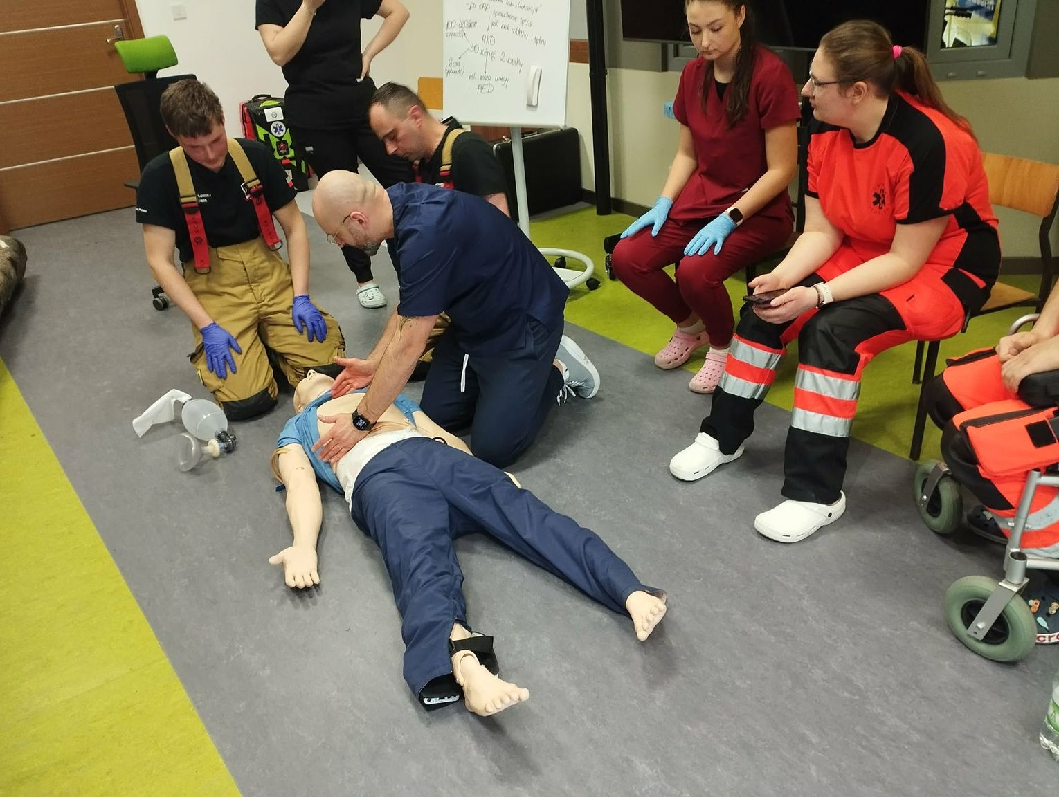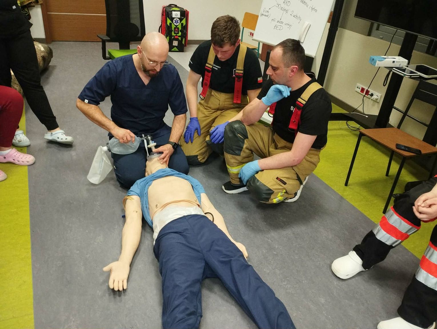 Spotkanie rozpoczęło się od wizyty w centrum symulacji medycznej uczelni. Strażacy mieli możliwość zapoznania się z nowoczesnym wyposażeniem dydaktycznym wykorzystywanym w kształceniu ratowników medycznych. Wraz ze studentami trzeciego roku ratownictwa medycznego przećwiczyli również podstawowe czynności ratownicze, przygotowując się do głównej części zajęć.