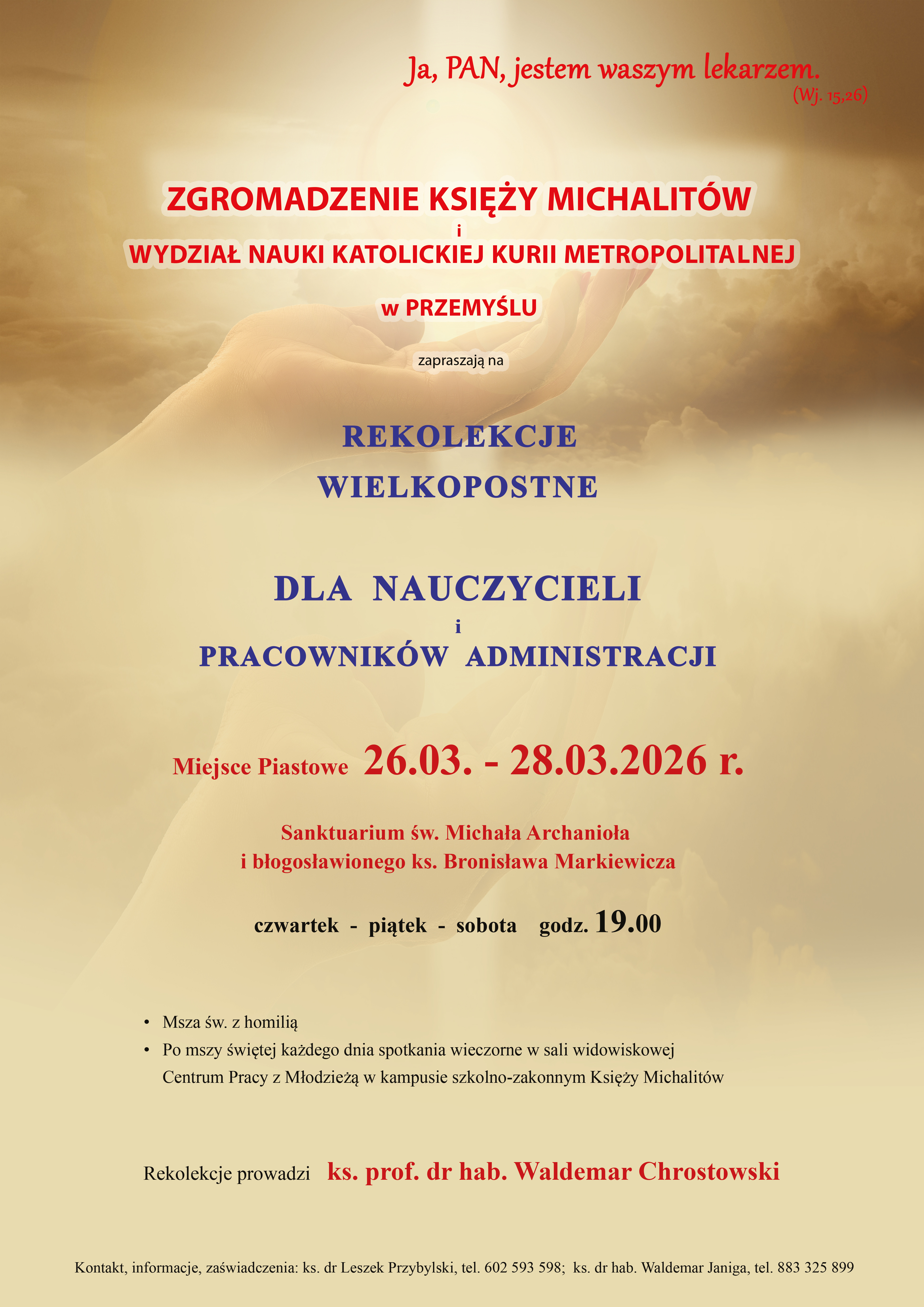 Organizatorzy zapraszają wszystkich zainteresowanych do udziału w tych szczególnych dniach duchowej refleksji i przygotowania do przeżywania tajemnicy Wielkiego Tygodnia i Świąt Zmartwychwstania Pańskiego.