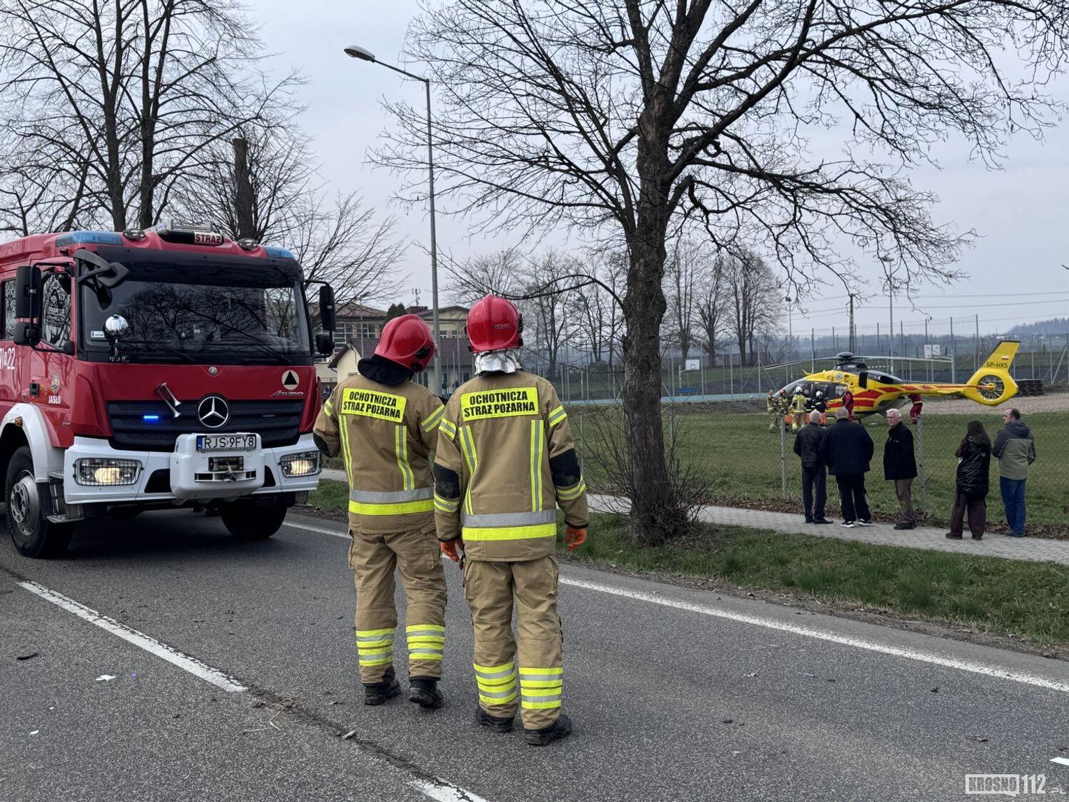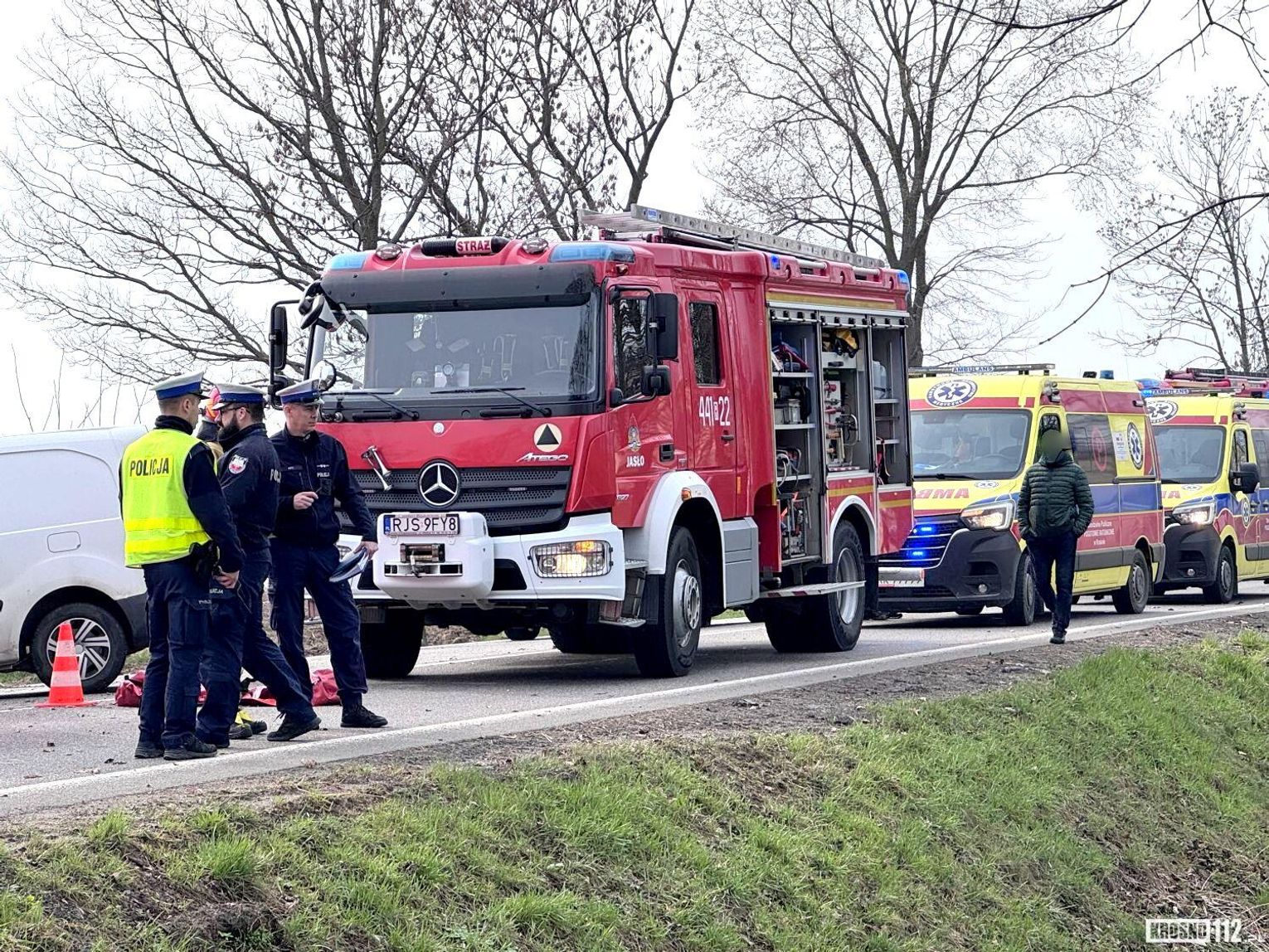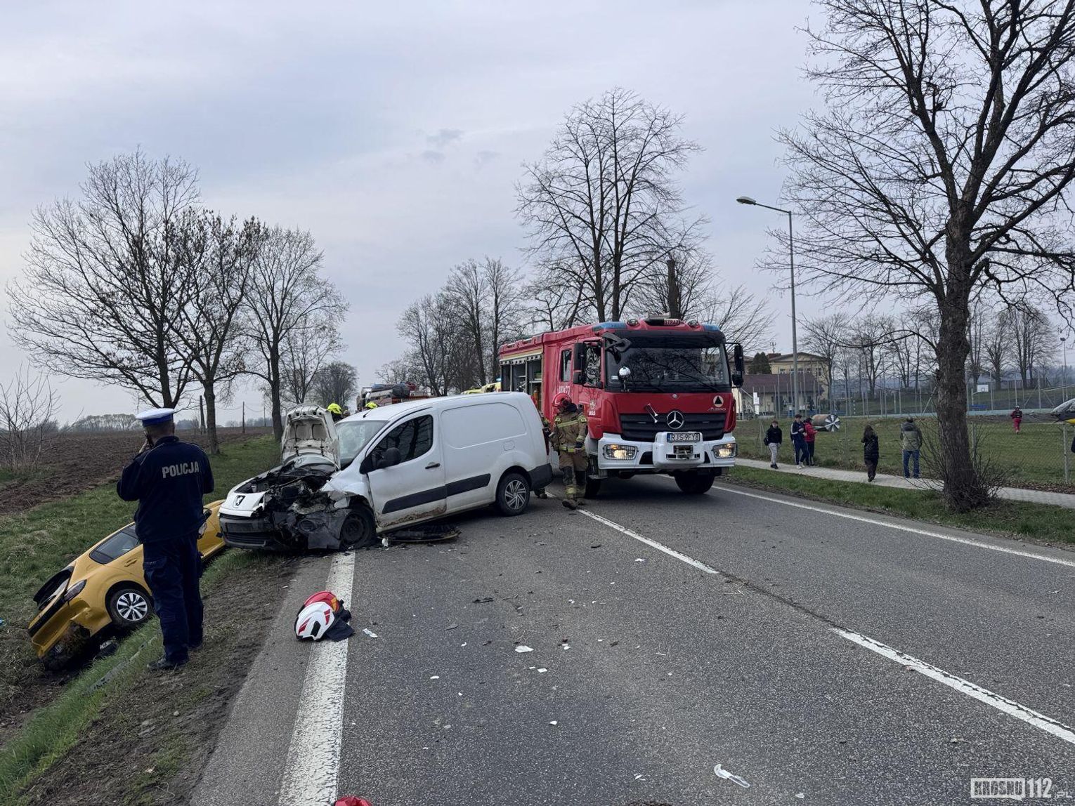 - Z dotychczasowych wstępnych ustaleń policjantów wynika, że kierujący Peugeotem jadąc w kierunku Jasła, najprawdopodobniej stracił przytomność, zjechał na przeciwległy pas ruchu i czołowo-bocznie zderzył się Peugotem, który prowadziła 25-letnia mieszkanka Szebni. W wyniku wypadku kobieta została przetransportowana śmigłowcem do szpitala w Krośnie. Pozostałe dwie osoby - kierowca białego Peugeota i pasażer 25-latki również trafili do szpitala - mówi podkom. Daniel Lelko z KPP Jasło.