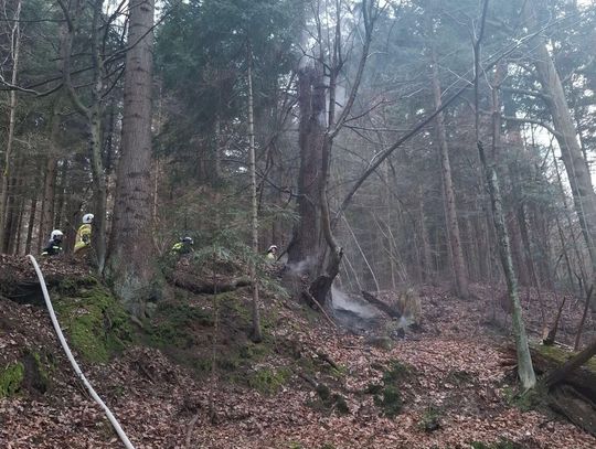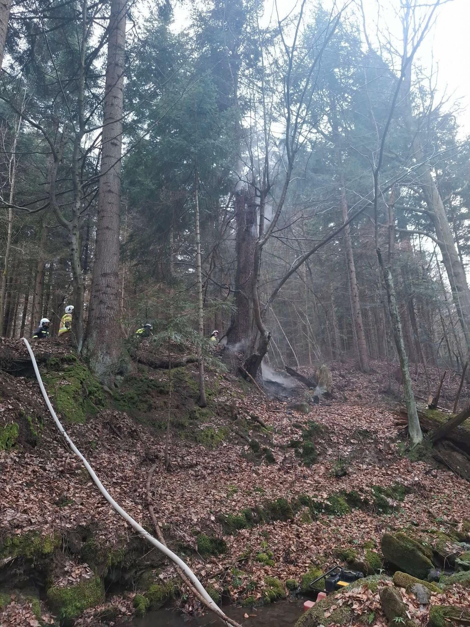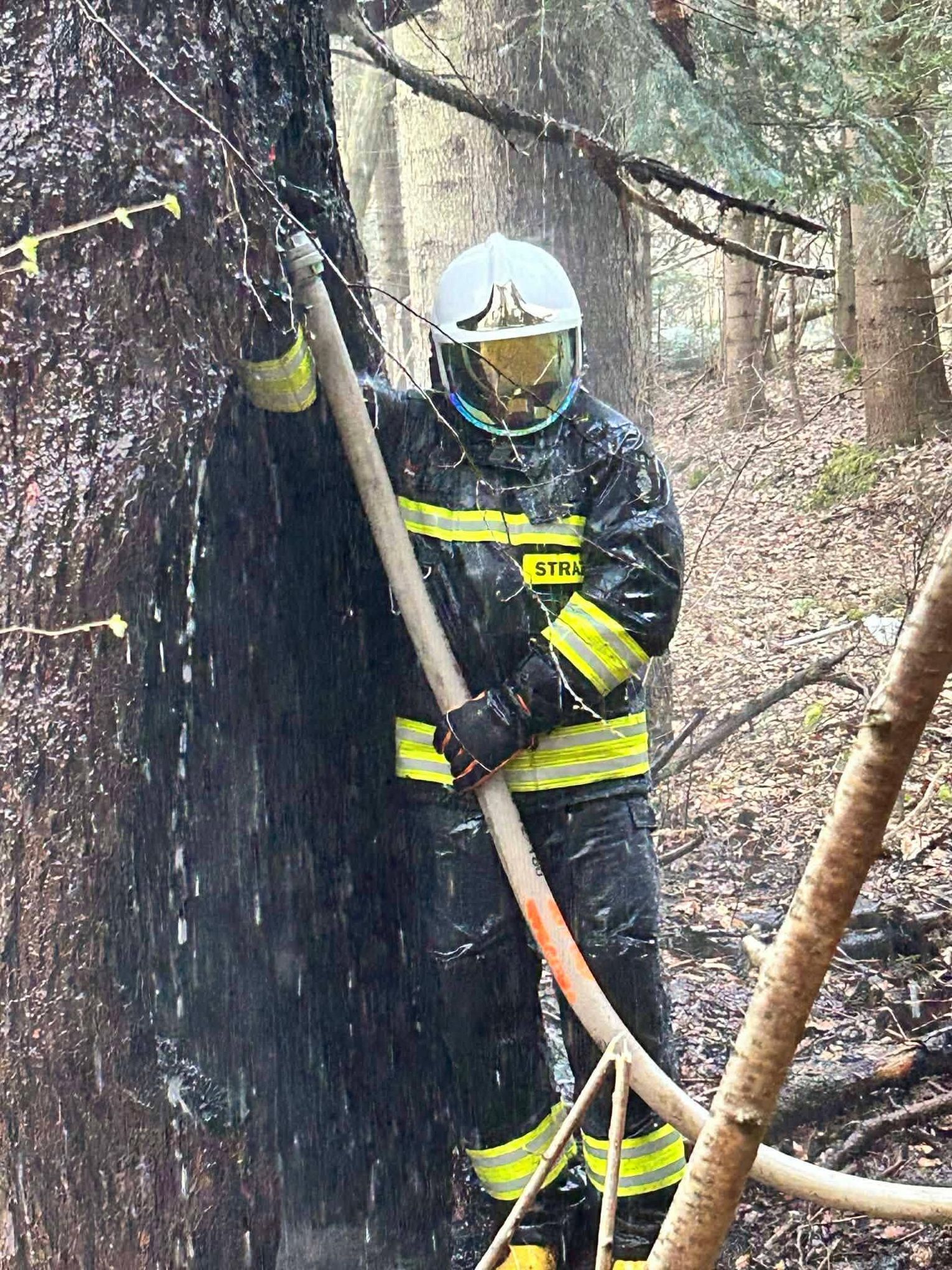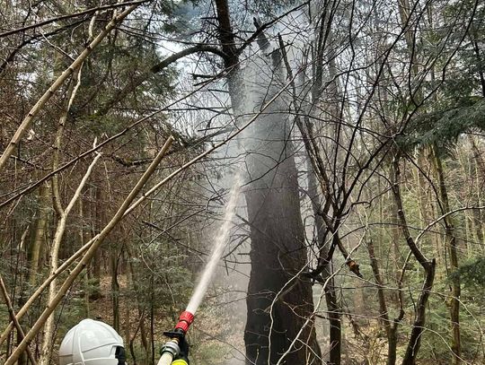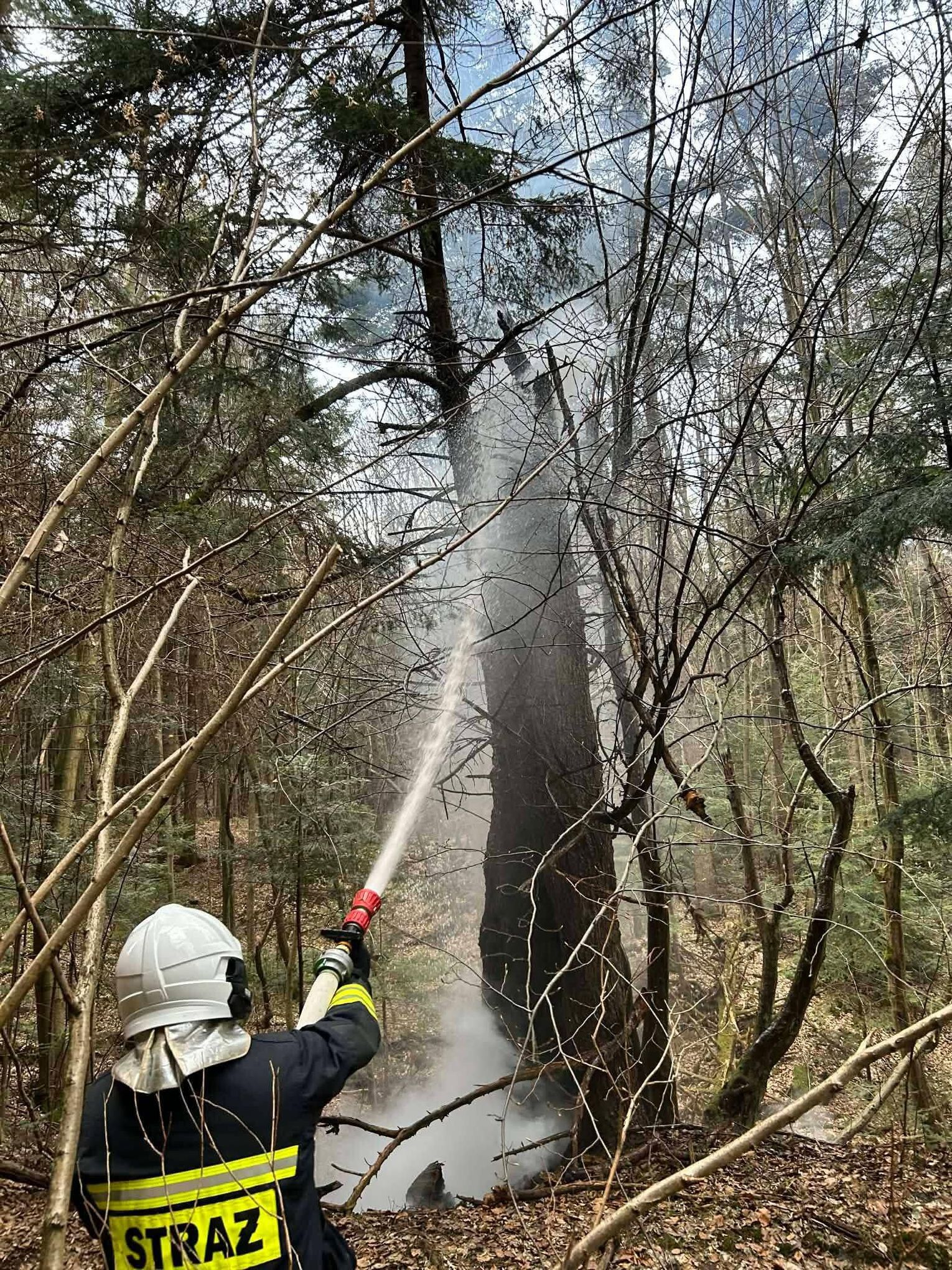 Do miejsca pożaru prowadziła trudna, wymagająca trasa. Strażacy musieli pokonać koryto rzeki oraz około 500-metrowy odcinek podmokłego i stromego terenu. Po dotarciu na miejsce zlokalizowano źródło ognia – płonące drzewo. Ze względu na brak hydrantów podjęto decyzję o zorganizowaniu zaopatrzenia wodnego z pobliskiego potoku.