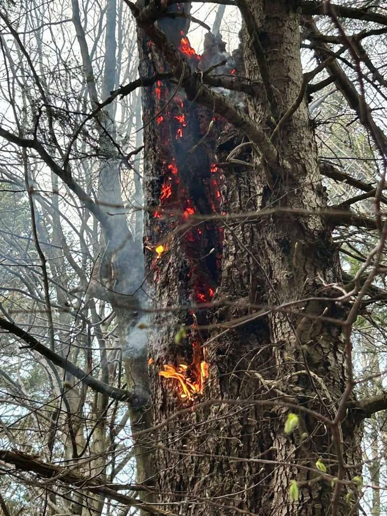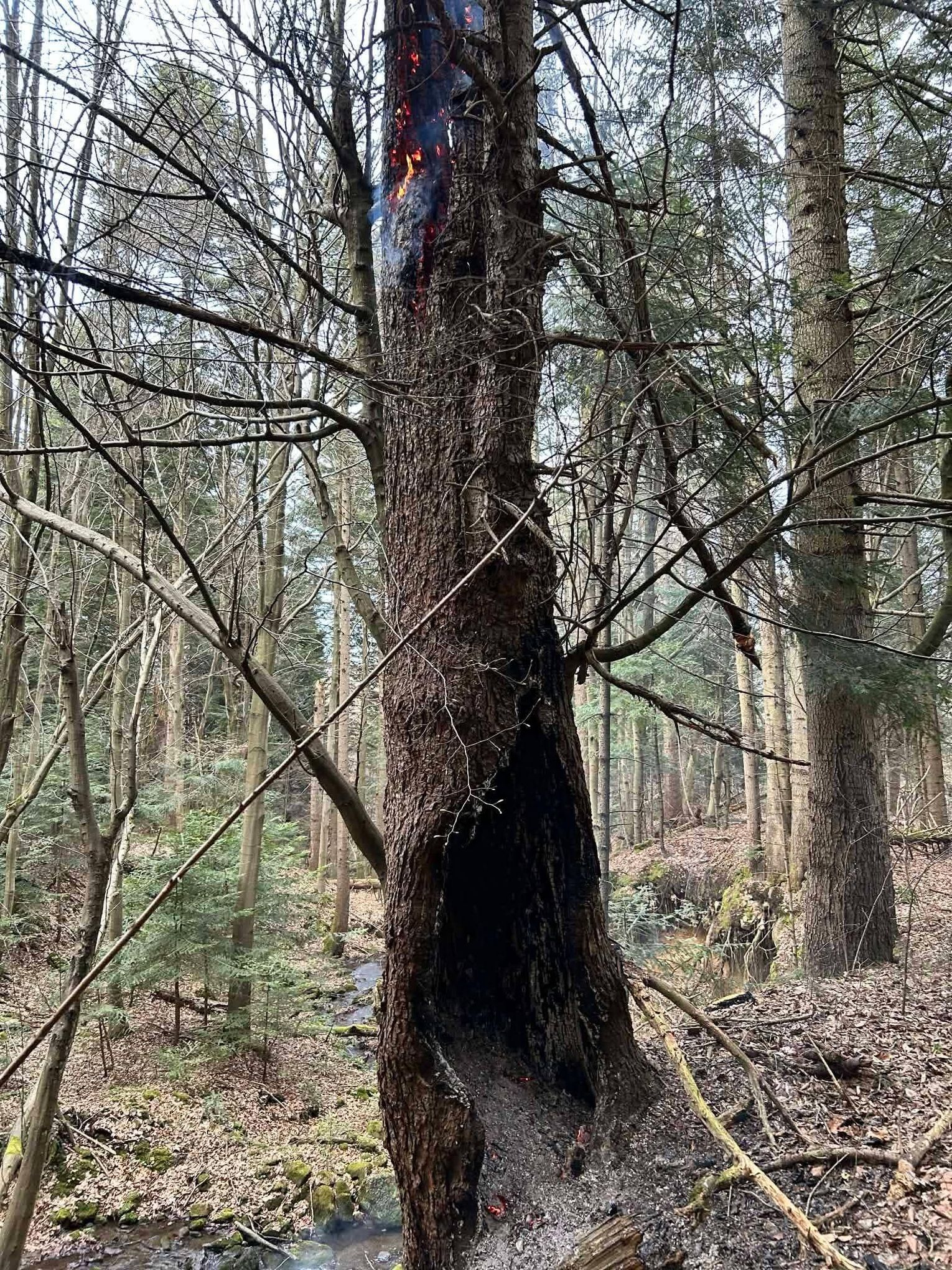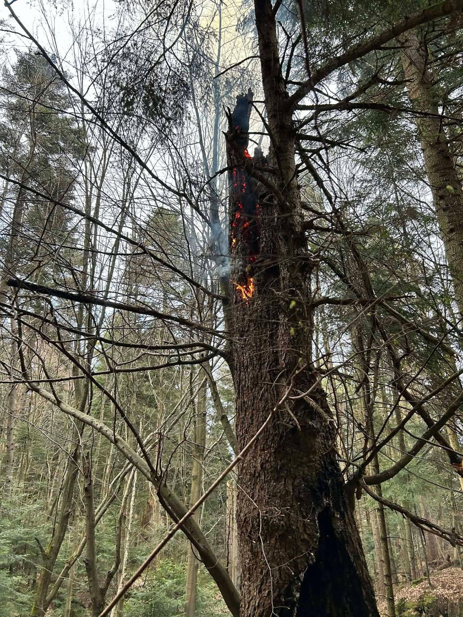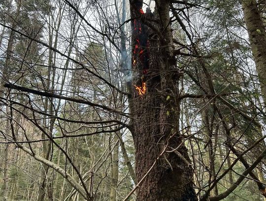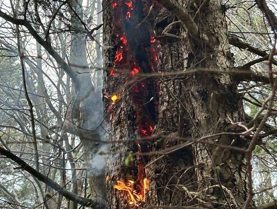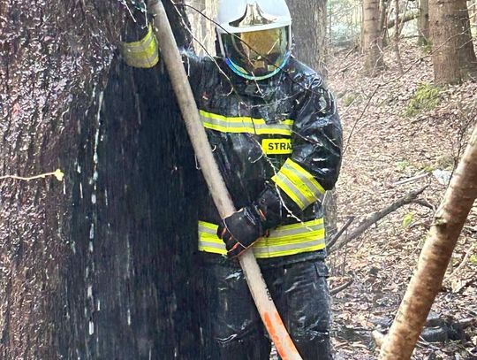 Do miejsca pożaru prowadziła trudna, wymagająca trasa. Strażacy musieli pokonać koryto rzeki oraz około 500-metrowy odcinek podmokłego i stromego terenu. Po dotarciu na miejsce zlokalizowano źródło ognia – płonące drzewo. Ze względu na brak hydrantów podjęto decyzję o zorganizowaniu zaopatrzenia wodnego z pobliskiego potoku.