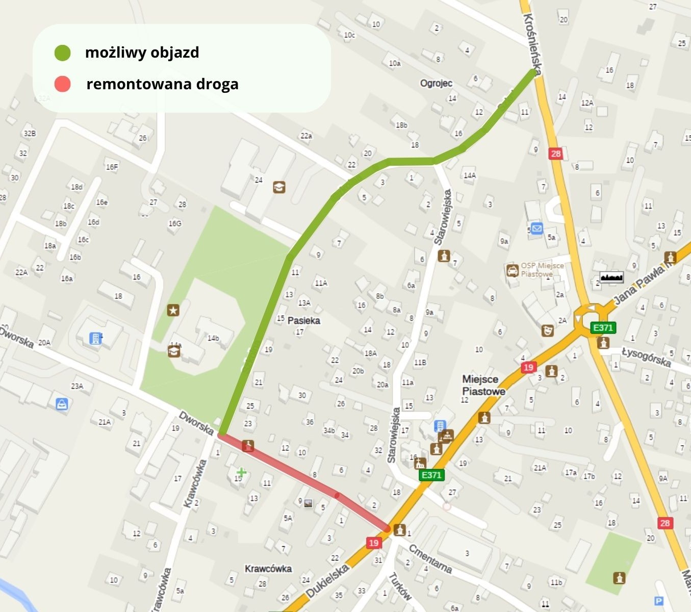 Utrudnienia pojawią się również w Miejscu Piastowym, gdzie zaplanowano modernizację nawierzchni na ulicy Dworskiej. Prace obejmują frezowanie starego asfaltu oraz ułożenie nowej warstwy bitumicznej.