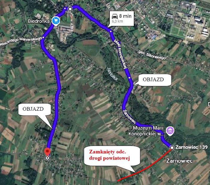Blokada rozpocznie się 22 kwietnia i obejmie fragment trasy w miejscowości Żarnowiec. W tym czasie przejazd pomiędzy Jedliczem, Długiem i Żarnowcem nie będzie możliwy. Zgodnie z aktualnym harmonogramem roboty mają potrwać do 15 maja 2026 roku.