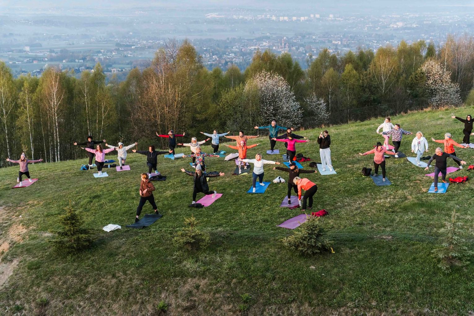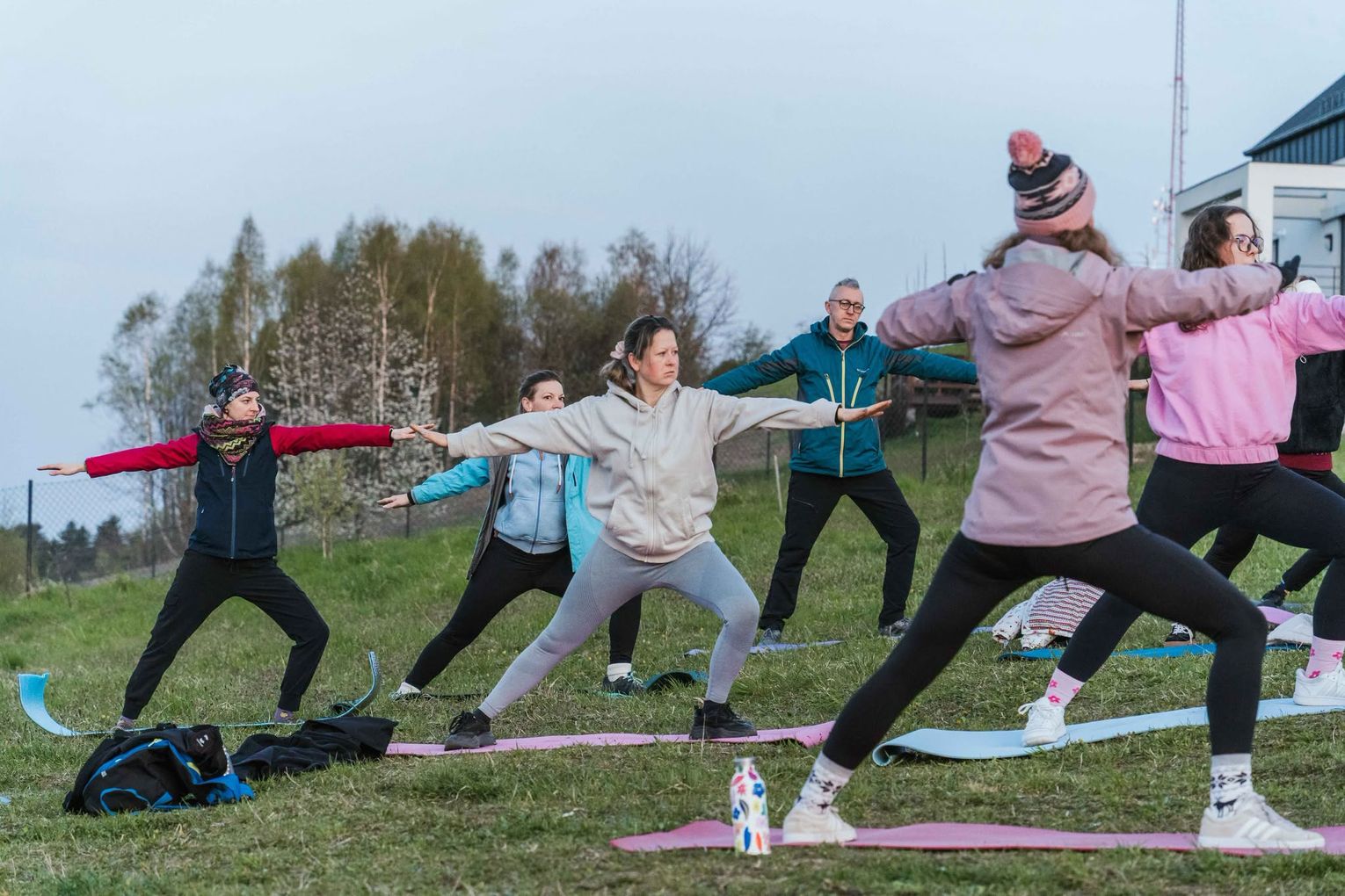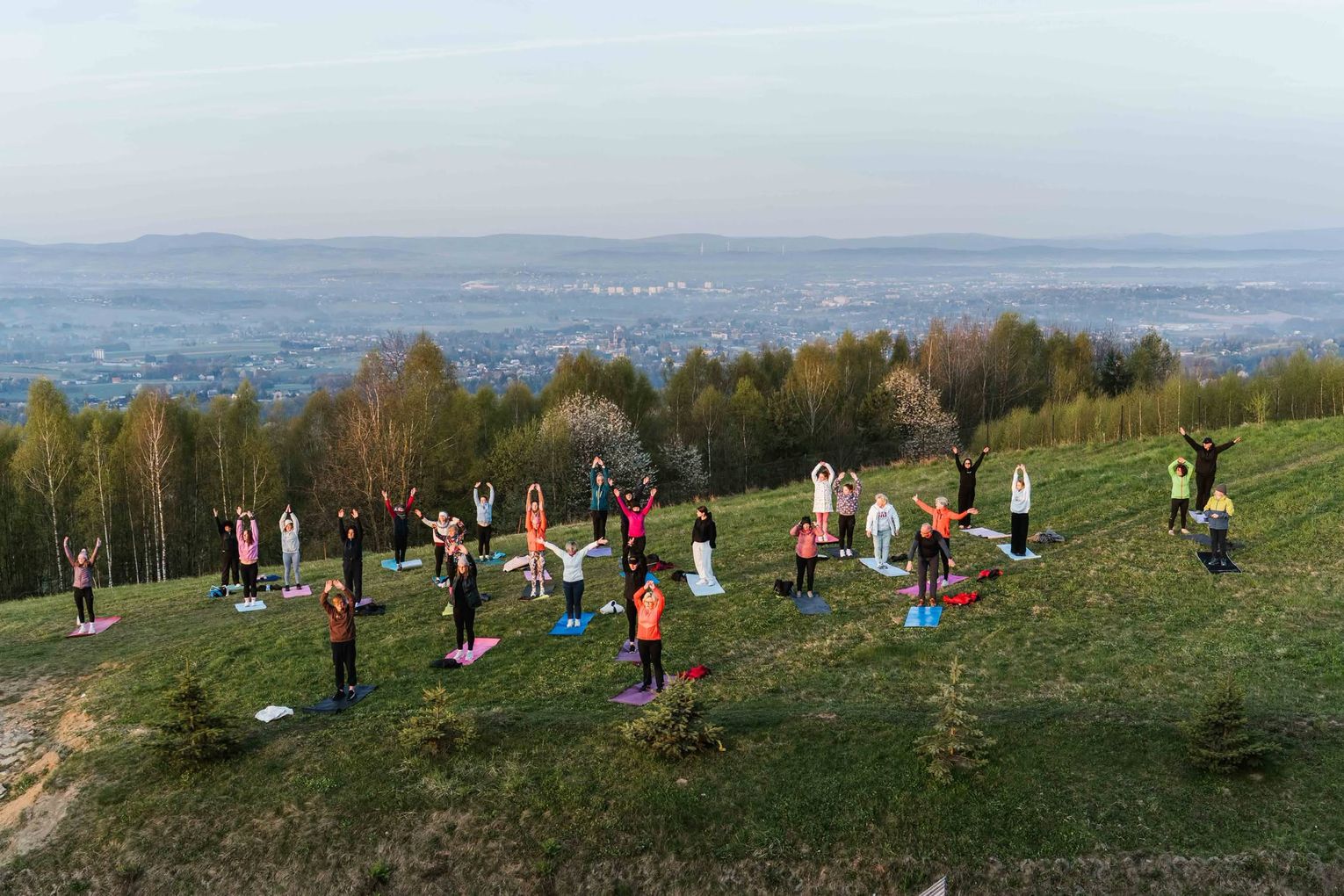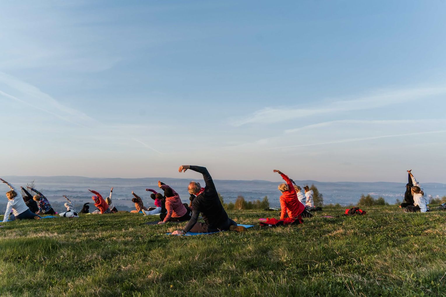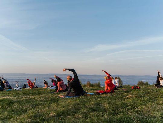 Mimo chłodnego poranka uczestnikom towarzyszyła wyjątkowa atmosfera – pełna radości, spokoju i wewnętrznego wyciszenia. Wędrówka zakończyła się na szczycie, gdzie wśród malowniczych krajobrazów i pierwszych promieni słońca rozpoczęła się sesja jogi prowadzona przez Lidię Urbanek. Zajęcia pozwoliły uczestnikom odnaleźć równowagę między ciałem a umysłem, a jednocześnie na chwilę zatrzymać się i w pełni doświadczyć piękna budzącego się dnia.