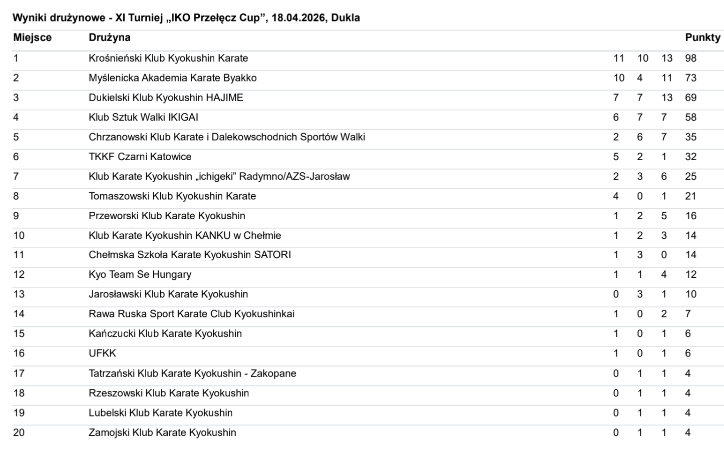 Dla krośnieńskiego klubu był to bardzo udany występ i potwierdzenie wysokiego poziomu szkolenia młodych zawodników. Bardzo wysoko, bo na 3. pozycji uplasował się Dukielski Klub Kyokushin HAJIME.