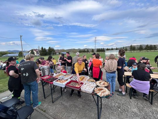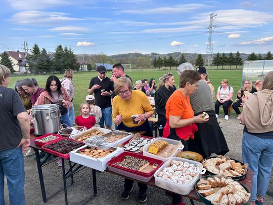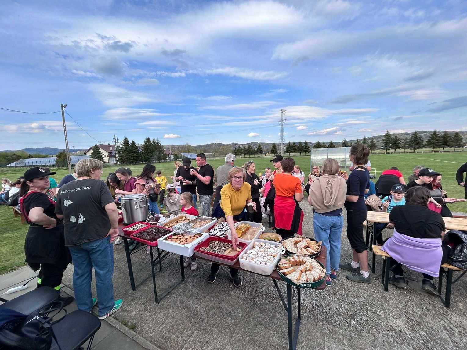 Po powrocie na stadion na uczestników czekała miła niespodzianka przygotowana przez Koło Gospodyń Wiejskich w Wojaszówce. Stoły wypełniły się domowymi wypiekami – ciastami, ciasteczkami, rogalikami i muffinkami. Nie zabrakło także tradycyjnego chleba ze smalcem i ogórkiem, a całość dopełniała aromatyczna kawa oraz herbata, które po aktywnym spacerze smakowały wyjątkowo dobrze.