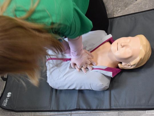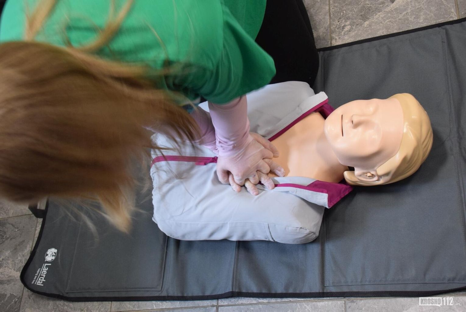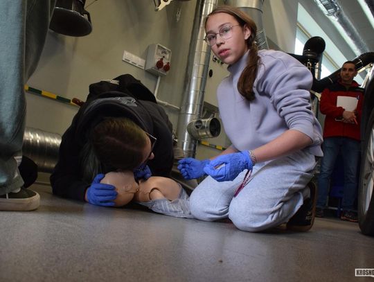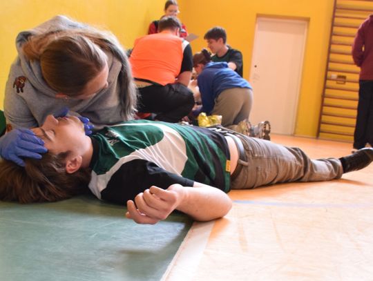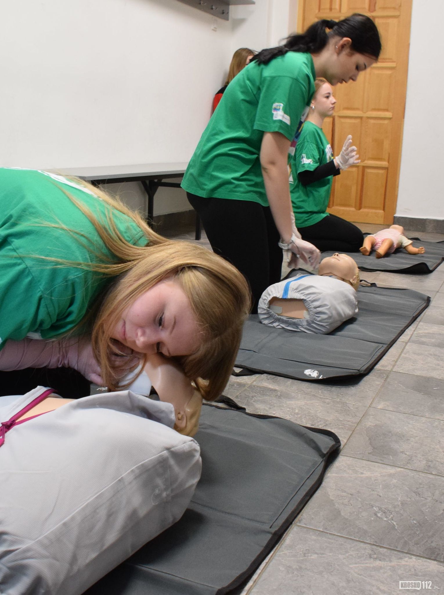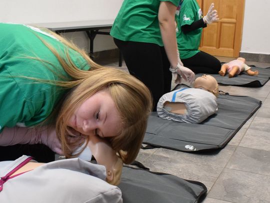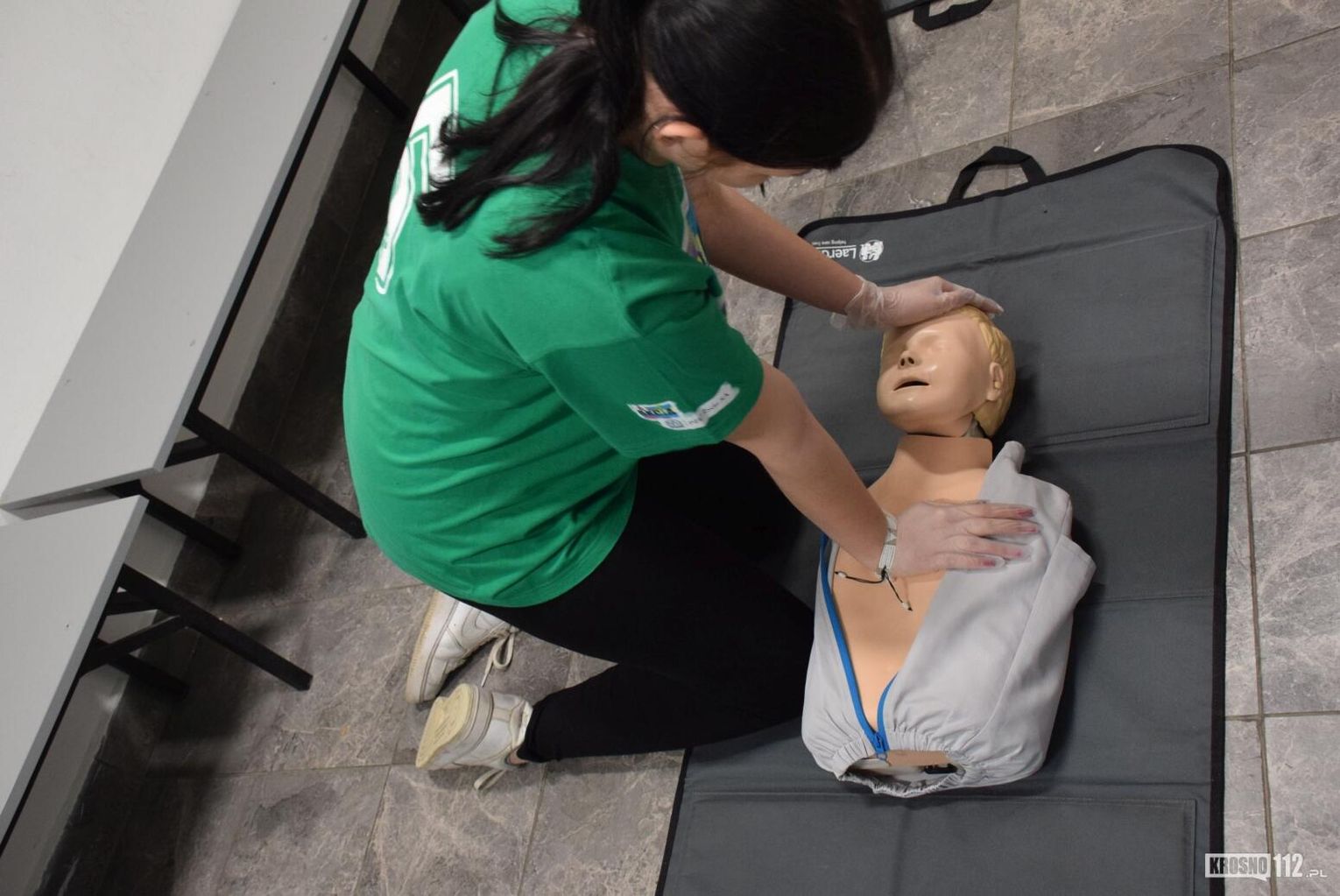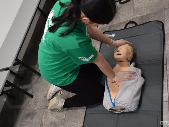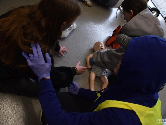Na trzecim stanowisku uczniowie prowadzili resuscytację krążeniowo-oddechową na fantomach niemowlaka, dziecka i osoby dorosłej według ostatnich wytycznych Europejskiej Rady Resuscytacji.