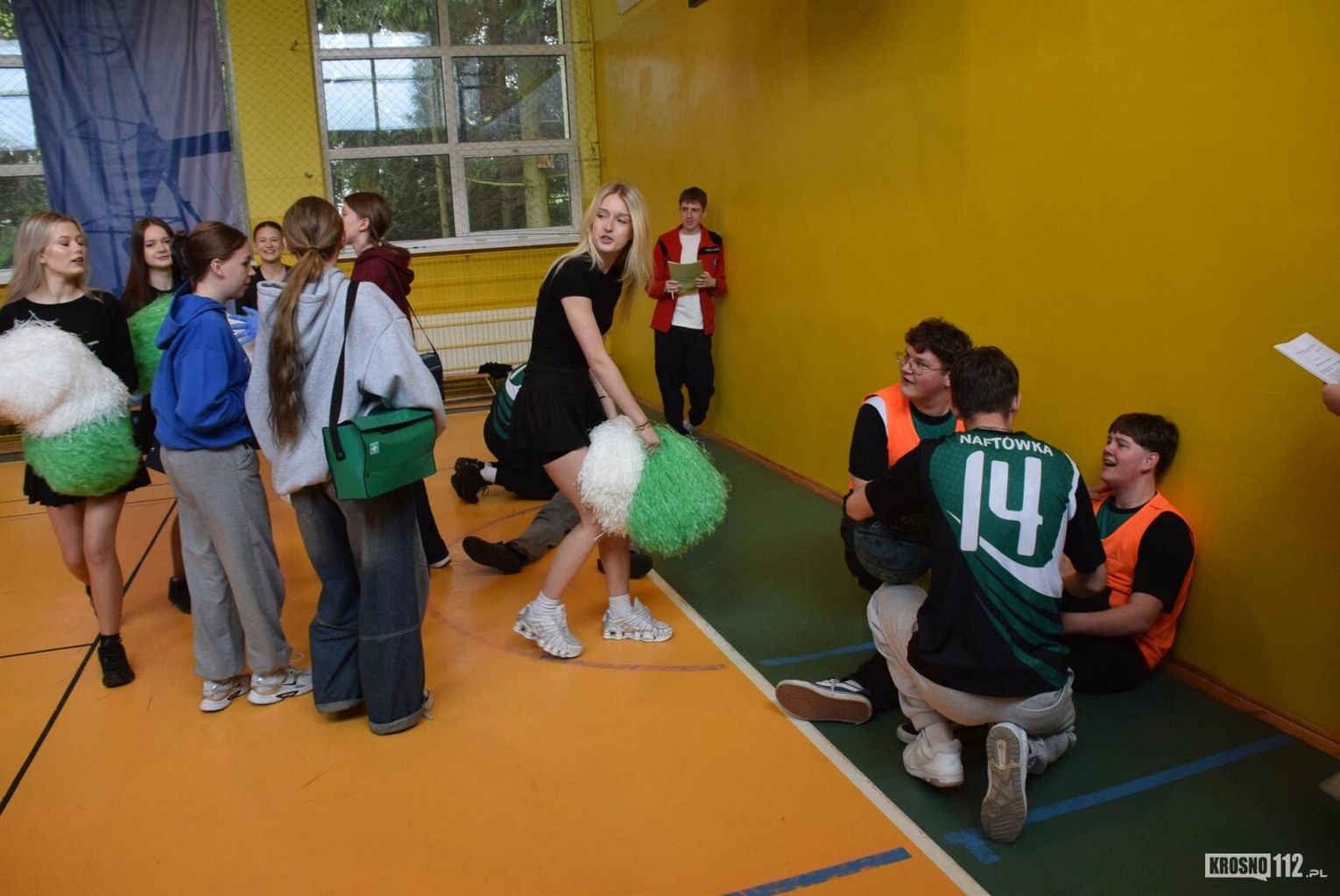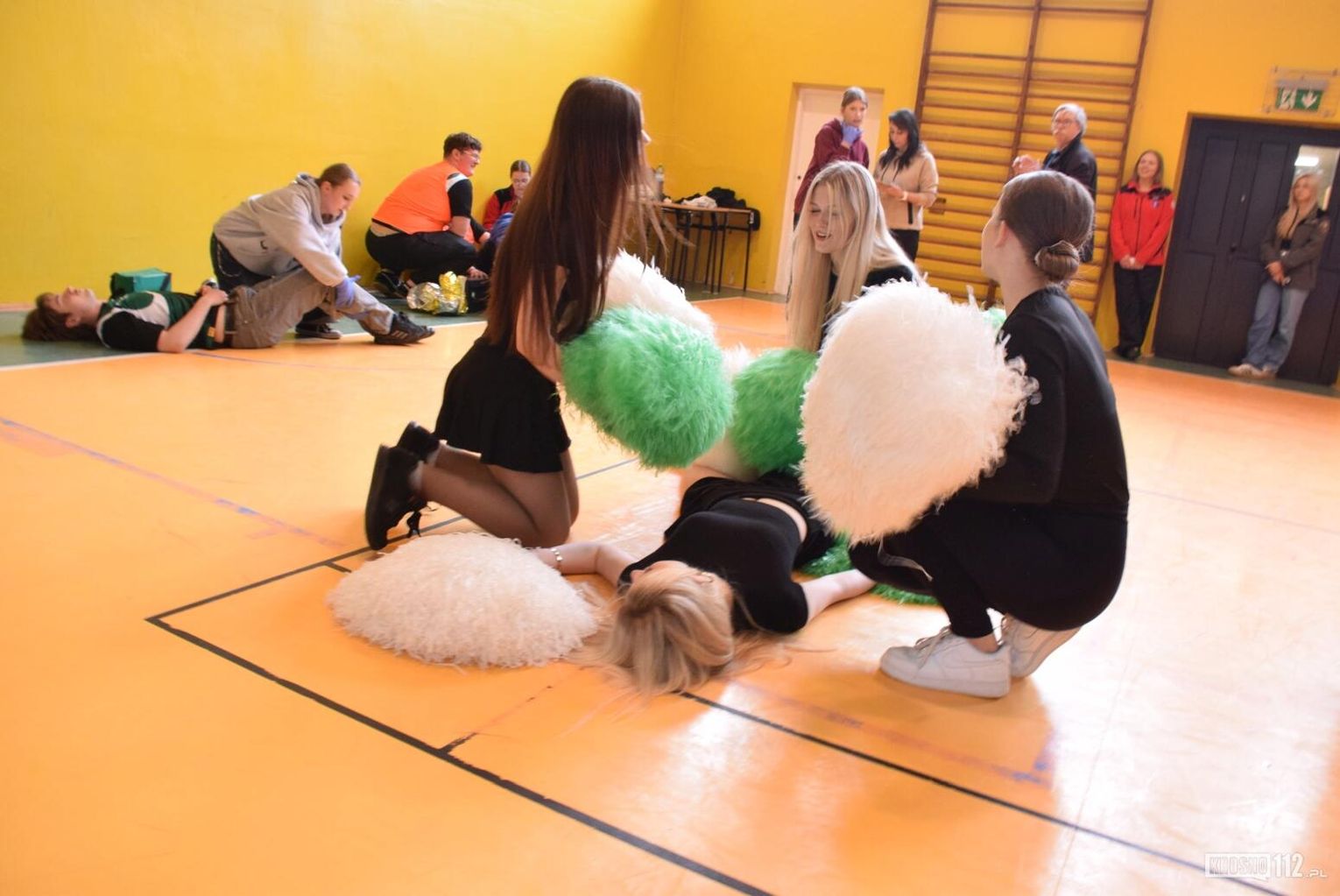 Na sali gimnastycznej uczniowie i nauczyciele „Naftówki” przygotowali scenariusz przypominający mecz koszykówki. W wyniku przepychanki jeden z zawodników uderzył głową o ścianę, po czym nieprzytomny osuwa się na parkiet. Objawy – krwawienie z nosa i ucha – wskazywały na poważny uraz.