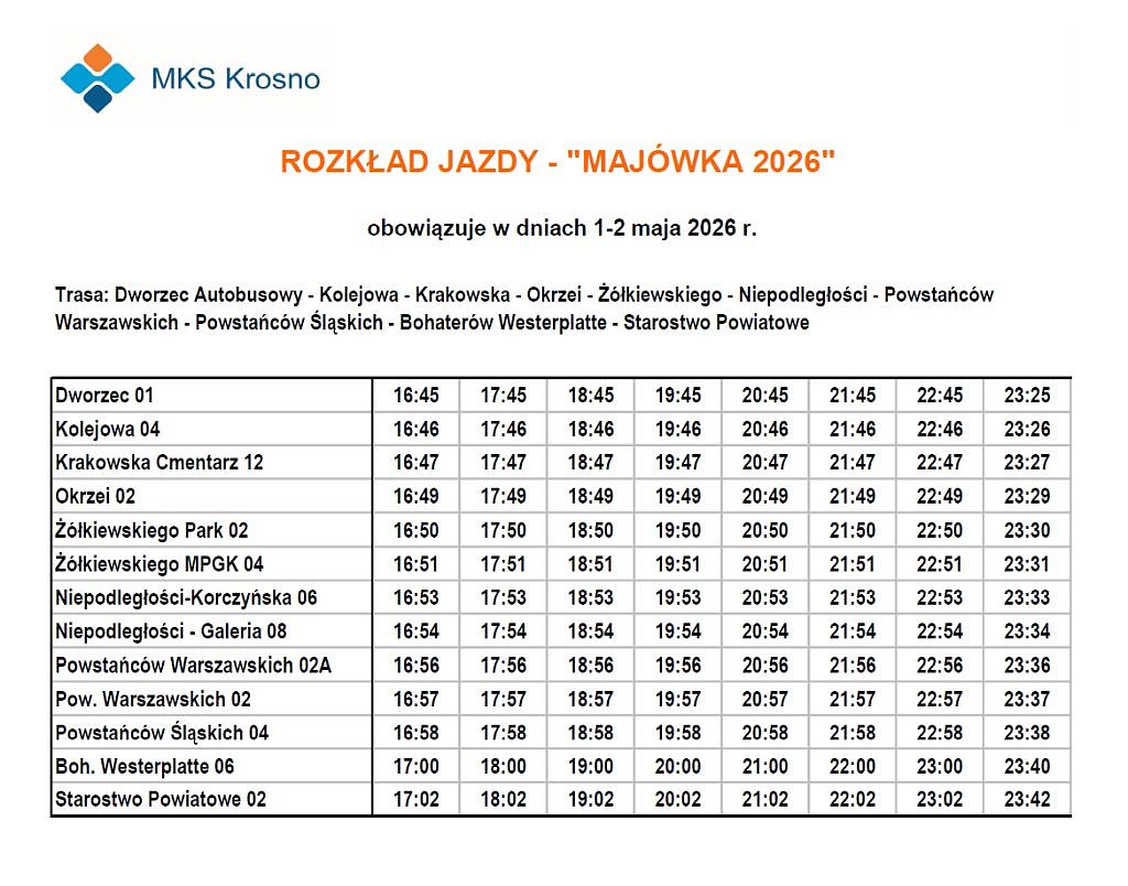 Dodatkowa linia autobusowa to element zabezpieczenia logistycznego „Majówki 2026”, która – jak co roku – przyciąga liczne grono uczestników.