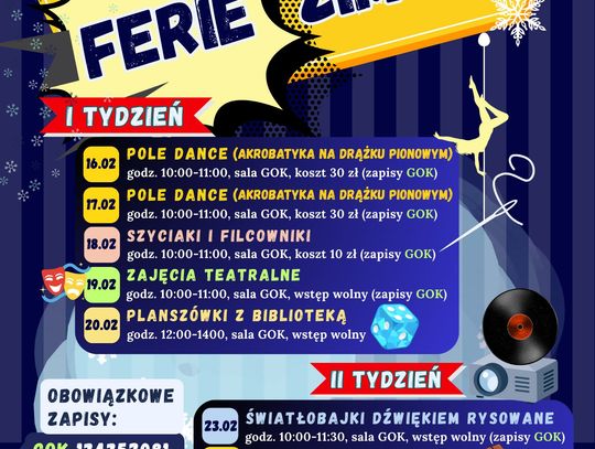 W programie m.in.: warsztaty i zajęcia teatralne, biblioteczne planszówki, pole dance i kreatywne rękodzieło, turnieje sportowe, szachy, festiwal dmuchańców oraz kino, lodowisko, basen i mnóstwo ruchu.