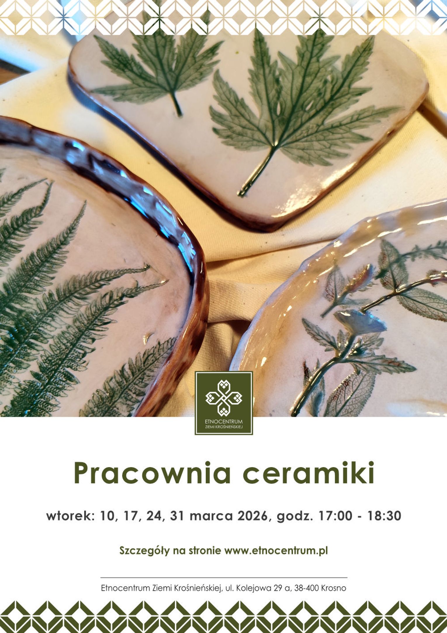 - Pracownia ceramiki – wtorki o 17:00 (10, 17, 24 i 31 marca) – zajęcia dla dorosłych
