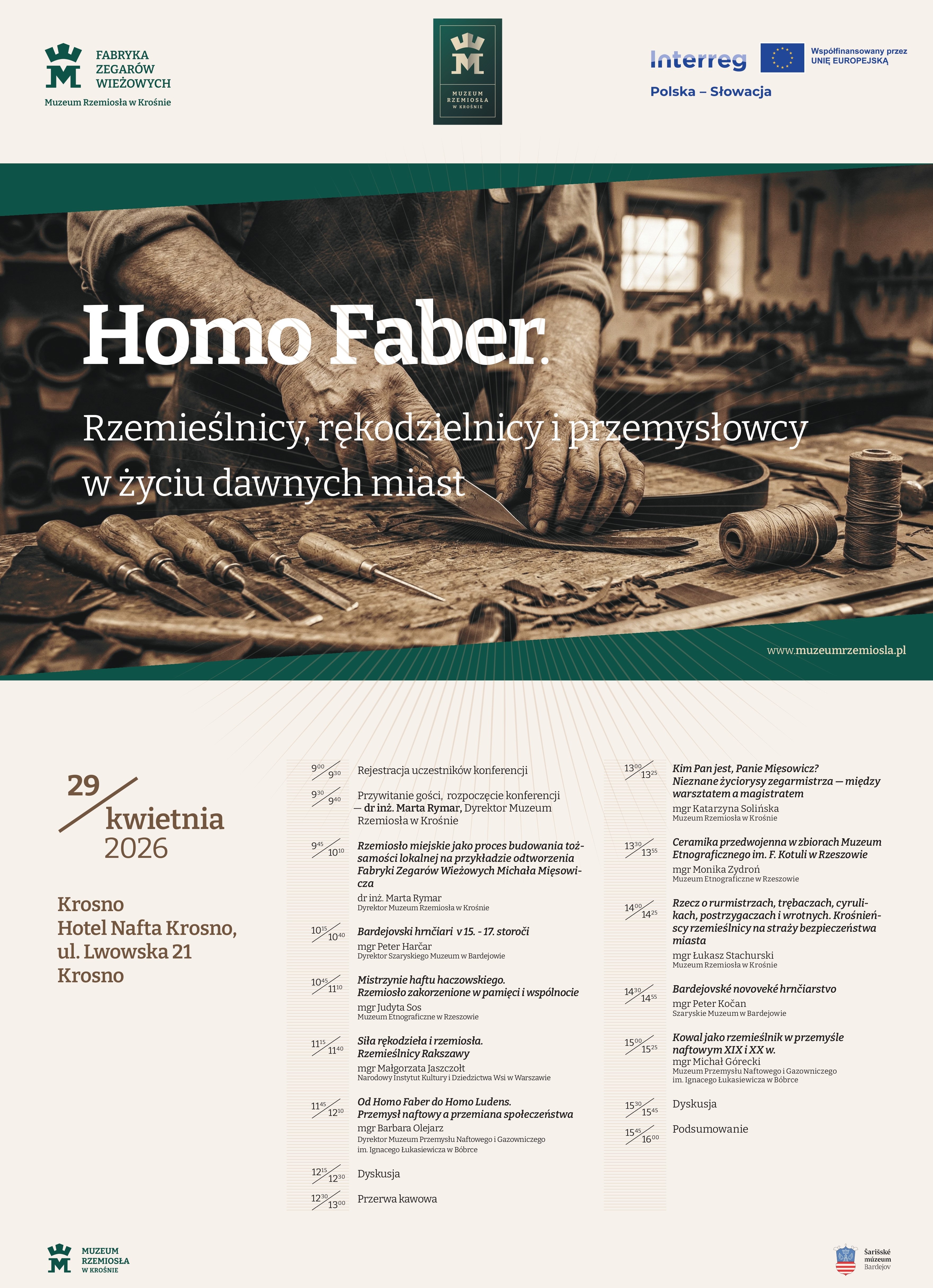 Muzeum Rzemiosła w Krośnie zaprasza do udziału w międzynarodowej konferencji naukowej „Homo Faber. Rzemieślnicy, rękodzielnicy i przemysłowcy w życiu dawnych miast”. Wydarzenie to odbędzie się 29 kwietnia 2026 r., w Hotelu Nafta Krosno (ul. Lwowska 21), w godzinach od 9:00 do 16:00. Przedsięwzięcie to ma na celu pogłębioną refleksję nad dziedzictwem rzemiosła oraz jego miejscem w procesach historycznych i kulturowych Europy Środkowej. Planowane obrady stanowią forum interdyscyplinarnej wymiany myśli, integrującej perspektywy badawcze z zakresu historii gospodarczej, dziejów rzemiosła, techniki, etnografii oraz studiów nad dziedzictwem kulturowym.